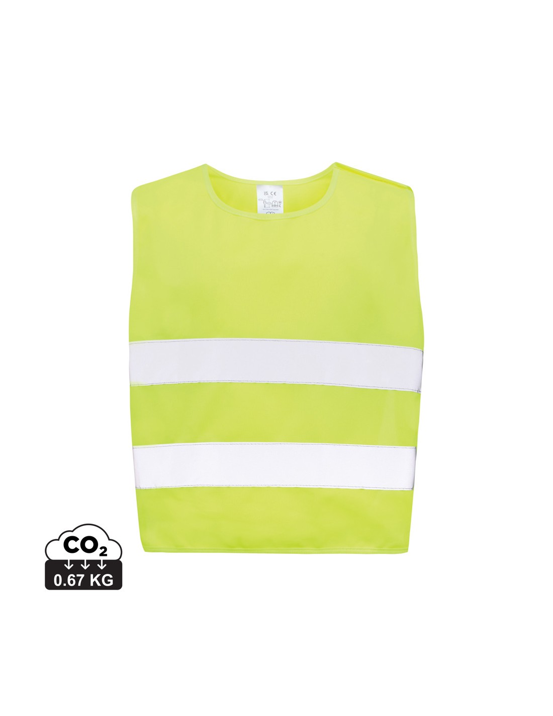 Synlighedsvest i størrelse XS designet til børn i alderen 3 til 6 år med en højde på 90 til 140 cm. Vesten har plads til dekoration på både for- og bagside. Den er udstyret med velcrolukning på skuldrene og forneden for ekstra sikkerhed og nem påtagning. De elastiske bånd på den modsatte side giver fleksibilitet, så den kan bæres komfortabelt over tykke frakker. Denne vest har gennemgået strenge tests og overholder EN 17353:2020 Type AB3. Desuden overholder den retningslinjerne for personlige værnemidler i forordning (EU) 2016/425 for personlige værnemidler i kategori II. Fremstillet af GRS-certificeret genanvendt PET. Samlet genanvendt indhold: 55% baseret på varens samlede vægt. GRS-certificering sikrer en fuldstændig certificeret forsyningskæde for de genanvendte materialer.