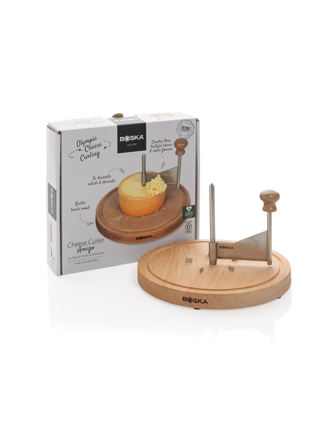 Ostespiralskæreren er den perfekte afslutning på dine retter. De er lækre på en italiensk pasta eller en frisk salat og er altid et hit til happy hour. Det er en sjov og velsmagende måde at nyde dine yndlingsoste på. Cheese Curler Amigo fra BOSKA - en B Corporation-certificeret virksomhed - har et blad i rustfrit stål og er perfekt til Tête de Moine og endda chokolade. Med fem korte stifter rundt om brættet får du et ekstra fast greb om osten. Prøv selv; krøller har aldrig set bedre ud! Ostespiralskæreren er kun egnet til håndvask og leveres med 10 års garanti.