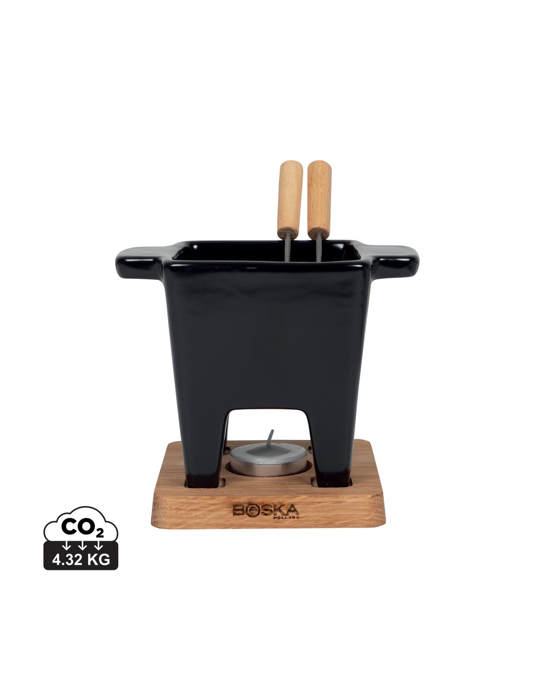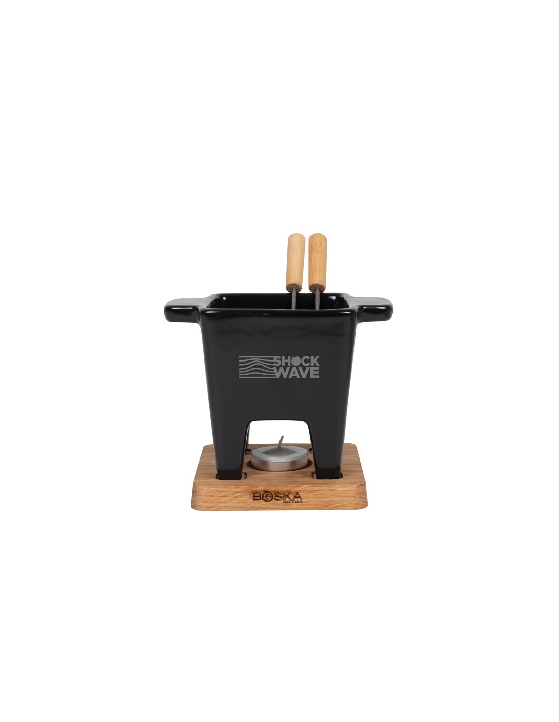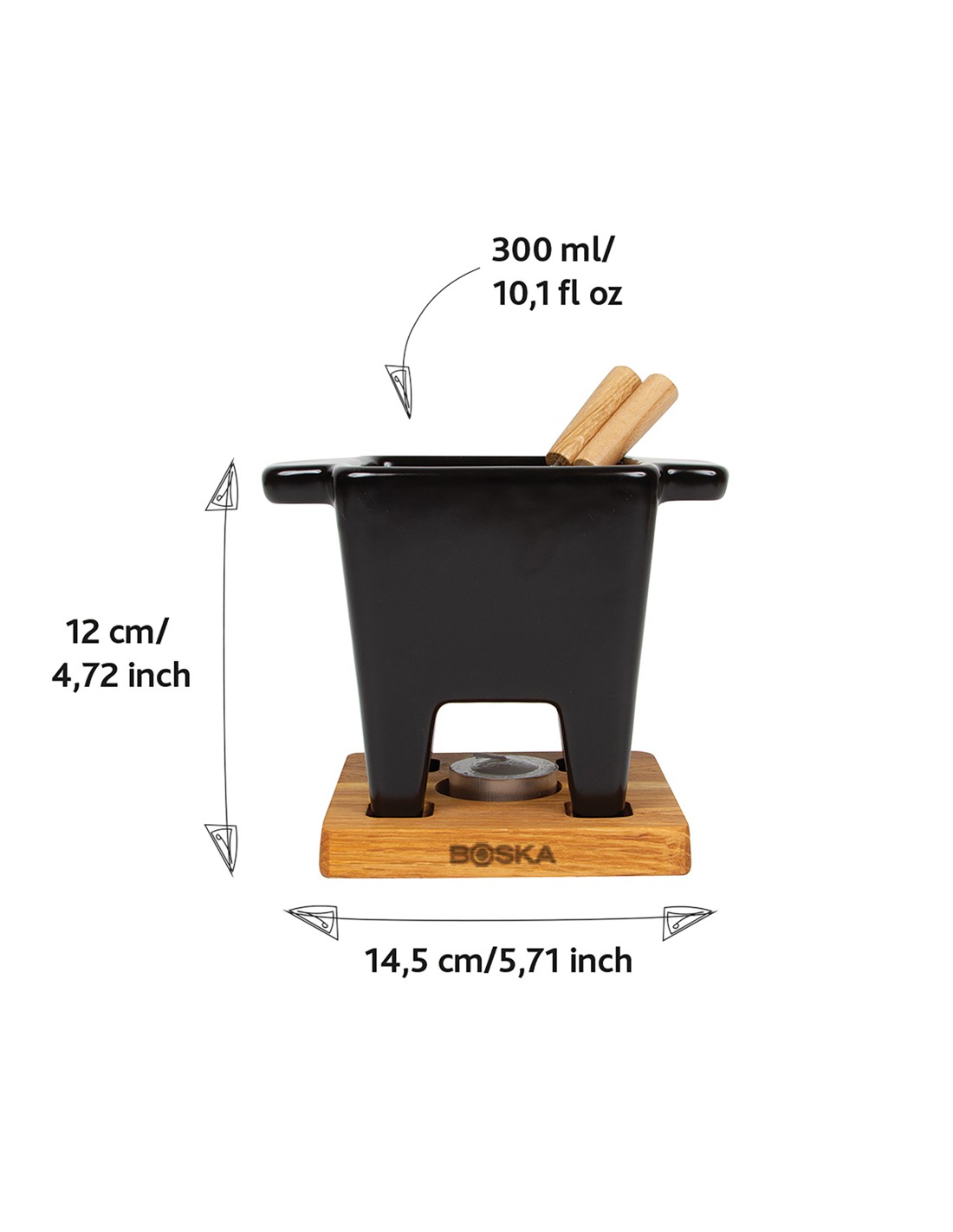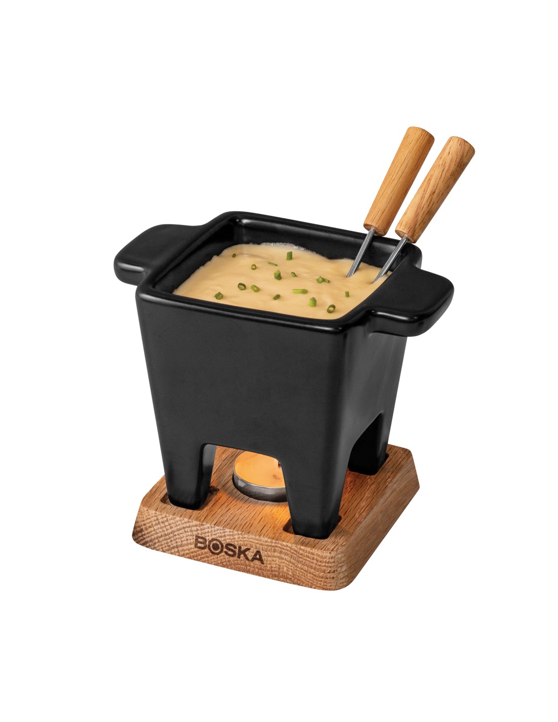Tapas for to? Dette lille fonduesæt med en unik form er perfekt til en intim aften for to. Tapas Fondue Nero fra mærket BOSKA - en B Corporation-certificeret virksomhed - kan bruges til at tilberede 175 gram ostefondue eller 200 ml varm sauce. Du skal bare varme det op i mikrobølgeovnen og dyppe løs! Fonduesættet tåler delvis opvaskemaskine; kun fonduepanden tåler opvaskemaskine. Desuden leveres det med livstidsgaranti.