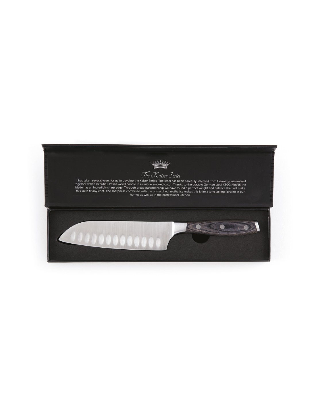 Santoku-kniv fremstillet af X50CrMoV15 tysk stål med et pakkatræ-håndtag. Easy-grip-håndtaget og sublim balance i bladet gør kniven behagelig og let at arbejde med. Størrelse: 14 cm blad.