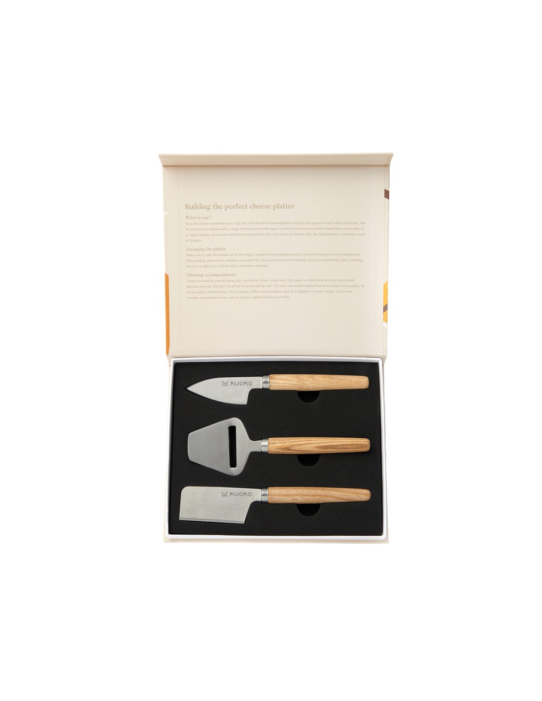 Den perfekte gave til osteelskere. Et komplet sæt med tre osteknive, så du kan skære, høvle, servere og smøre alle former for hård og blød ost. Dette elegante sæt af osteknive har asketræshåndtag og blade af rustfrit stål giver ostebrættet efter middagen et strejf af stil.