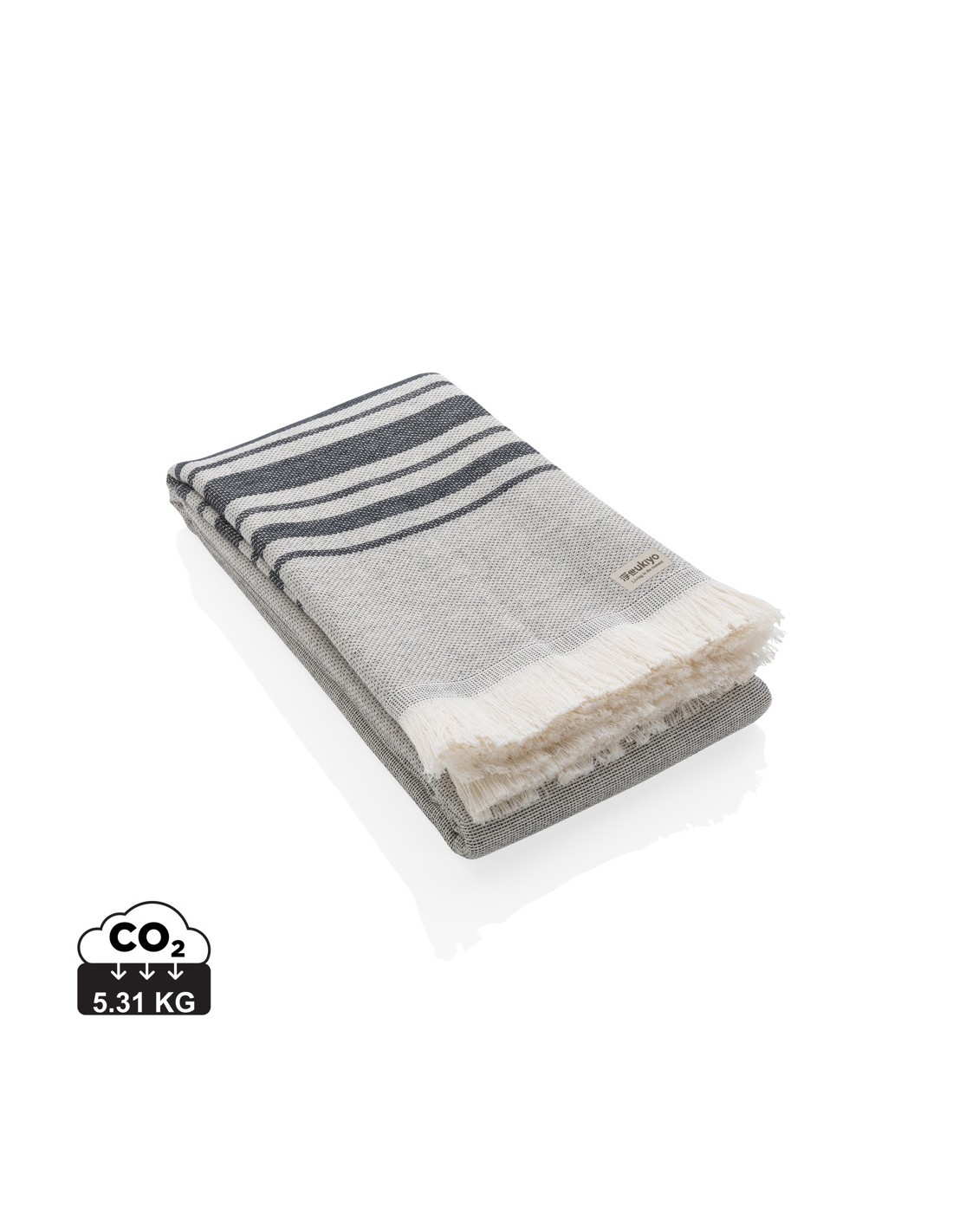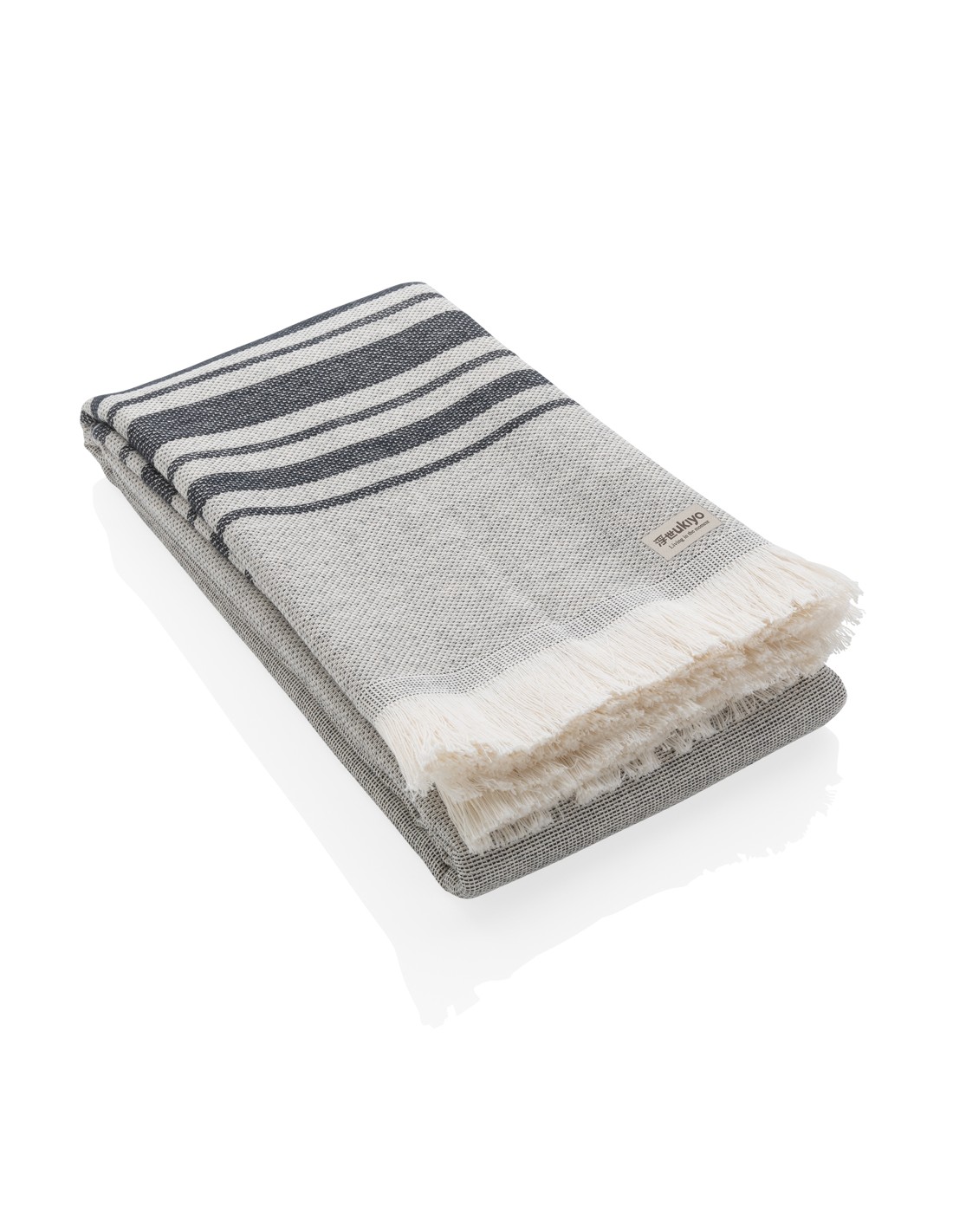 Dette lette, meget absorberende, sandbestandige og hurtige tørre håndklæde, er et af de bedste bæredygtige håndklæder på markedet. Hammam håndklæder er multifunktionelle: du kan også bruge det som en picnic, baby tæppe eller som en yoga, strand og gym håndklæde. Selv som en dug. Det bedste af det hele er, at det tynde materiale gør det ultra bærbart og let at have med i din strandtaske, kuffert eller over skulderen. Indeholder 12% genanvendt bomuld, er super blødt og silkeagtig at røre ved. Med AWARE™ tracer, der validerer den ægte brug af genanvendt bomuld. Hvert håndklæde sparer 597,8 liter vand. 2% af provenuet af hvert IMPACT-produkt, der sælges, doneres til Water.org. Produceret i Portugal.