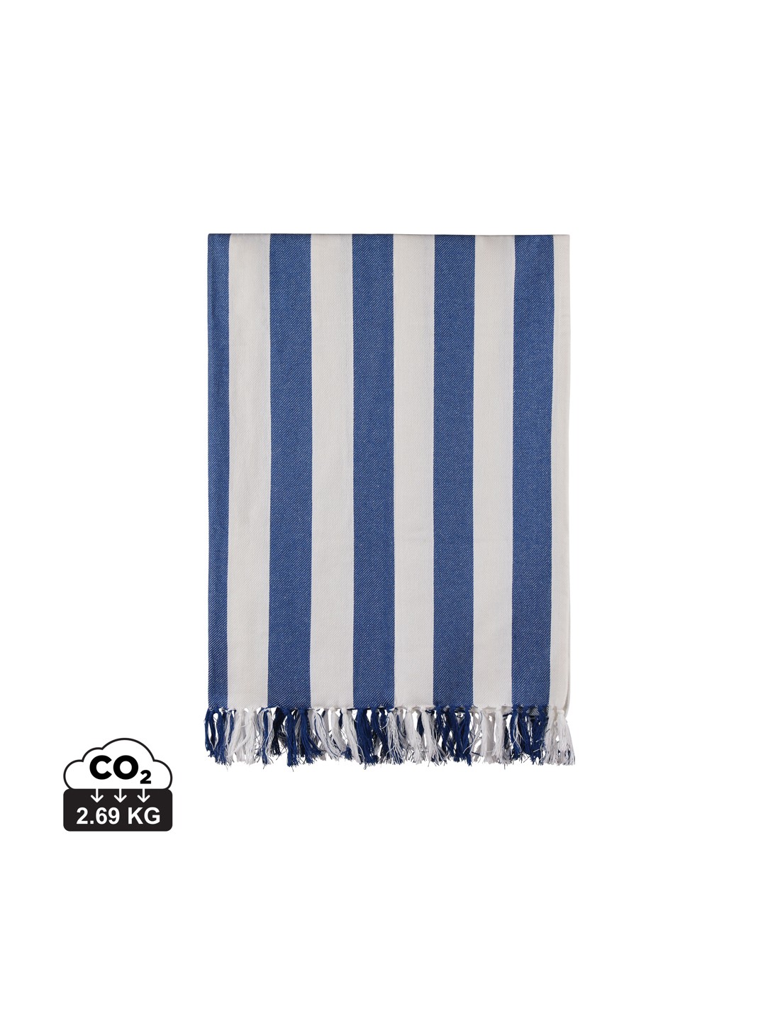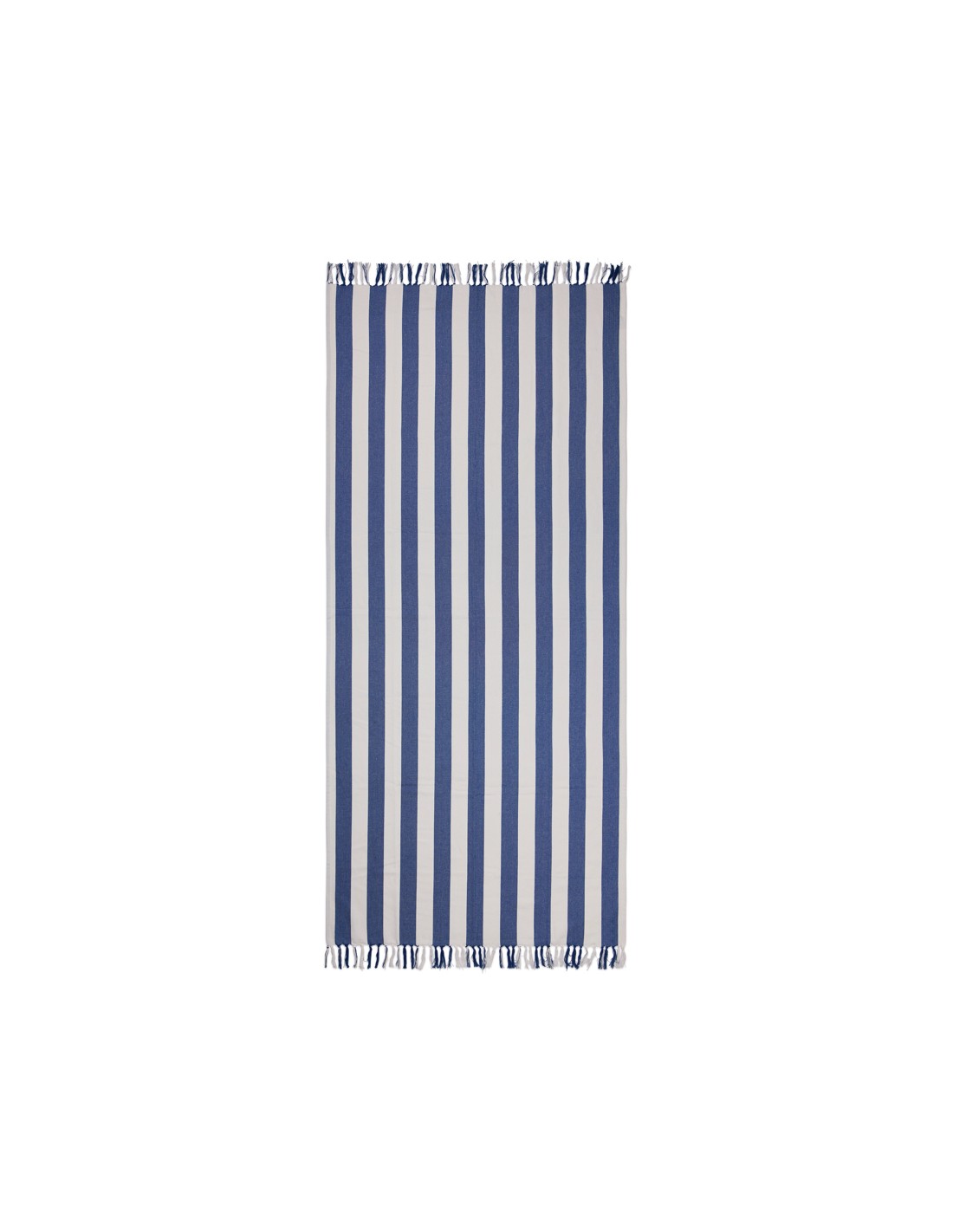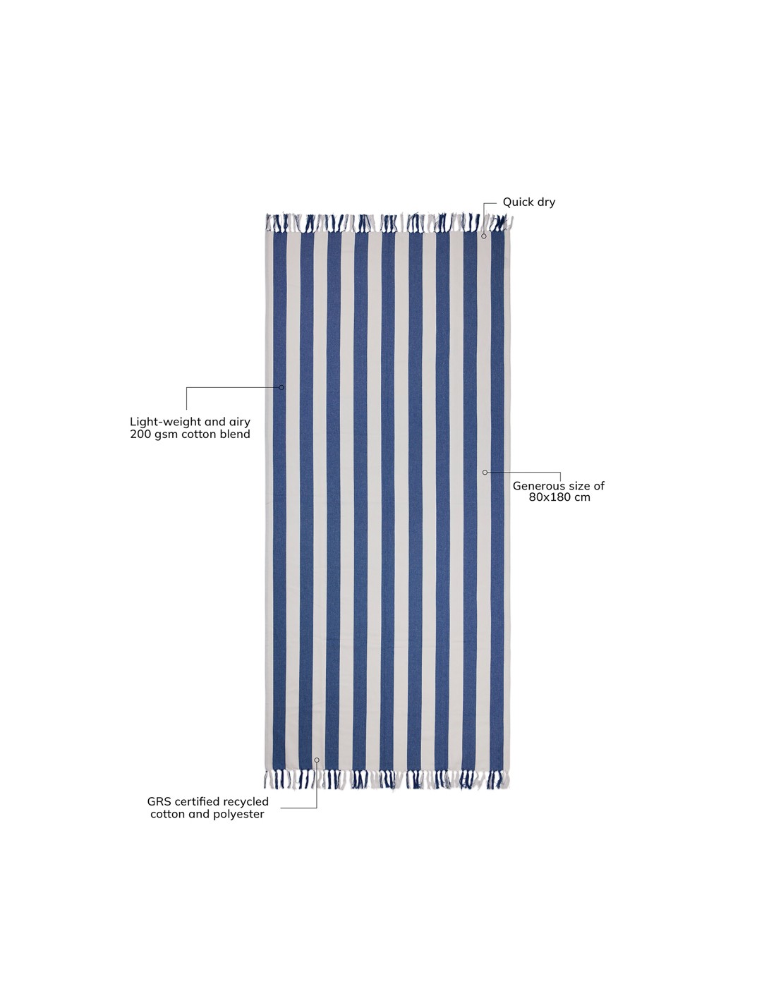 Dette hamam strandhåndklæde har et klassisk tofarvet stribet mønster med frynser på de korte sider. Det er fremstillet af en let og luftig 200 gsm blanding, som kombinerer komforten fra bomuld med de hurtigtørrende fordele fra polyester. Den måler 80x180 cm og er perfekt til stranden eller poolen. Certificeret af GRS (Global Recycled Standard), GRS certificering garanterer, at hele forsyningskæden for de genanvendte materialer er certificeret. Det samlede genanvendte indhold er baseret på den samlede produktvægt. Dette produkt indeholder 68 % GRS certificeret genbrugsbomuld og 29 % GRS certificeret genanvendt polyester.