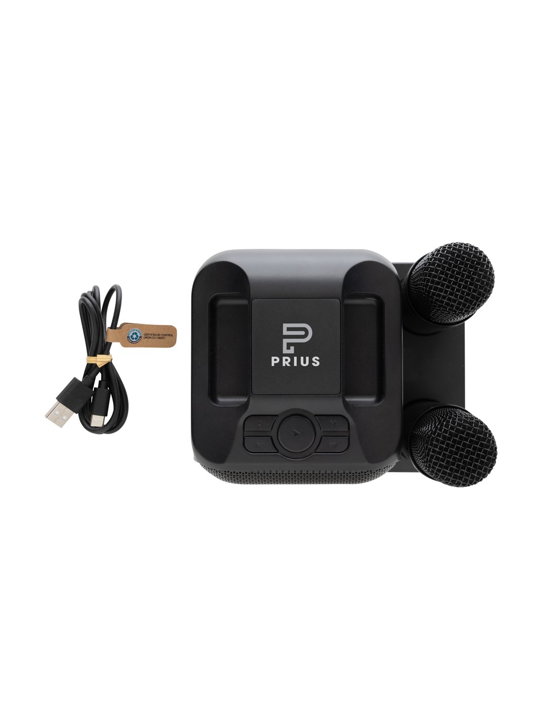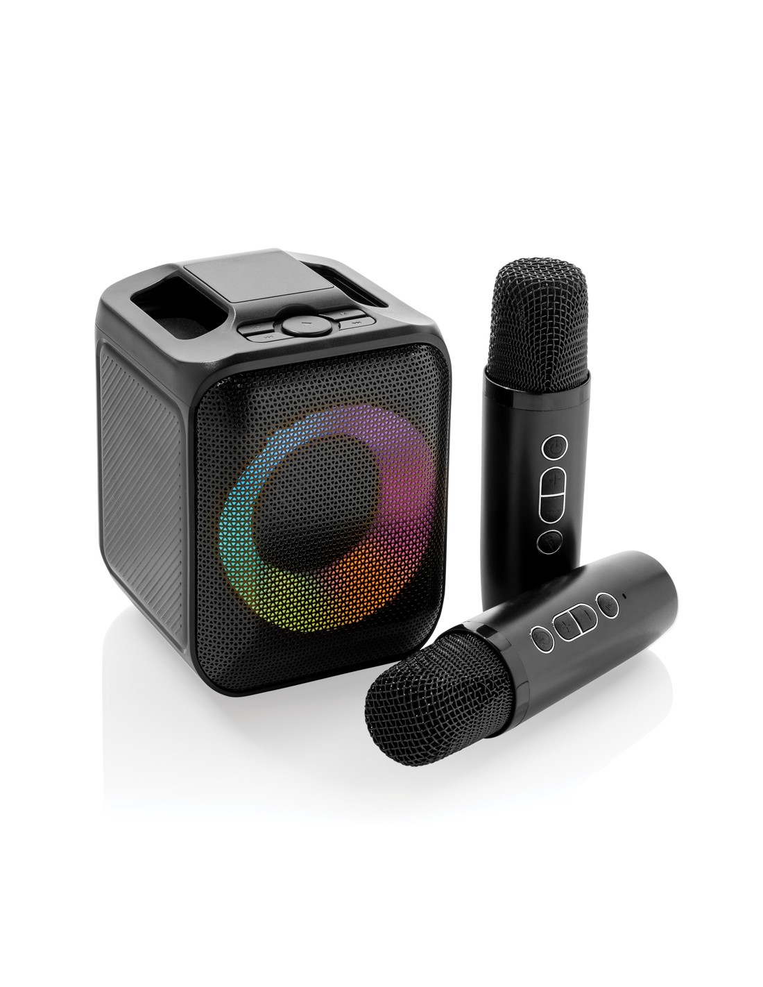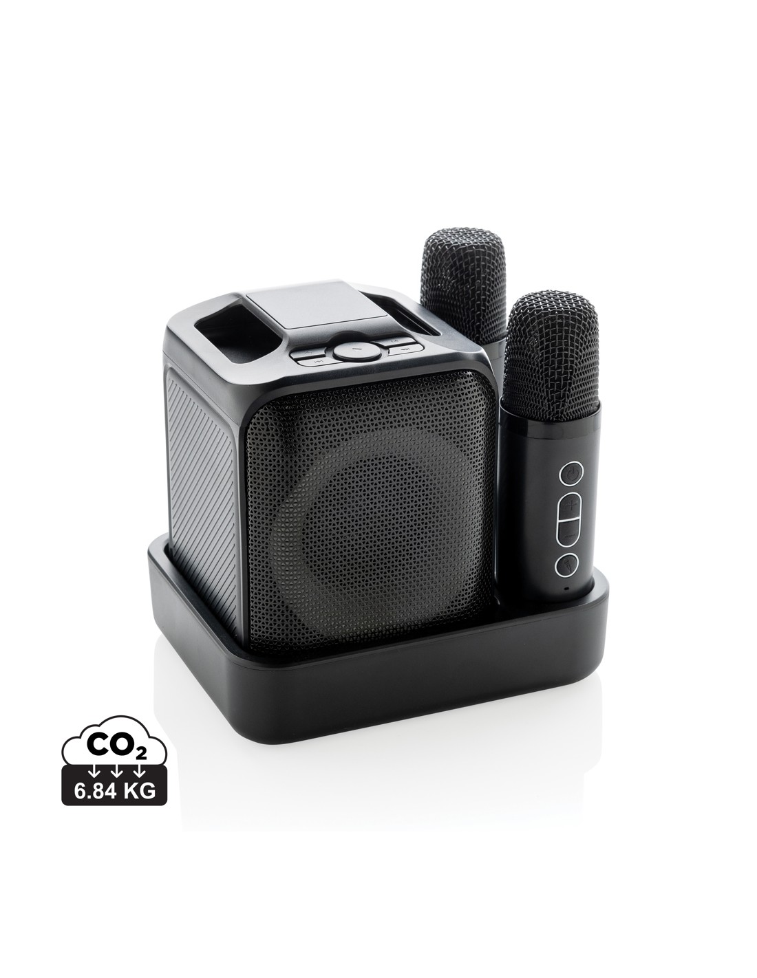 Syng, dans og hav det sjovt med dine venner med dette kvalitetskaraokesæt med to mikrofoner, der giver dig mulighed for at synge i stereo. Højttaleren og mikrofonen leveres med en induktions opladerbase, så du nemt kan oplade alle tre på samme tid. Du skal blot tænde for en musikvideo med tekst eller aktivere teksten i din foretrukne musikafspiller og gøre dig klar til timevis af sjov! 5W højttaleren leveres med et 2000 mAh batteri, der giver op til 6 timers brug. Højttaleren understøtter også TF-kort og USB til musik. Når du bruger mikrofonerne, kan du bevæge dig op til 10 meter væk fra højttaleren. Højttaleren er fremstillet af RCS (Recycled Claim Standard) certificeret genanvendt ABS. Samlet genanvendt indhold: 53 % baseret på varens samlede vægt. RCS certificering sikrer en fuldstændig certificeret forsyningskæde for de genanvendte materialer. Inklusive type C-opladerkabel fremstillet af RCS-certificeret genanvendt TPE. Pakket i FSC®-mix. Fri for PVC.