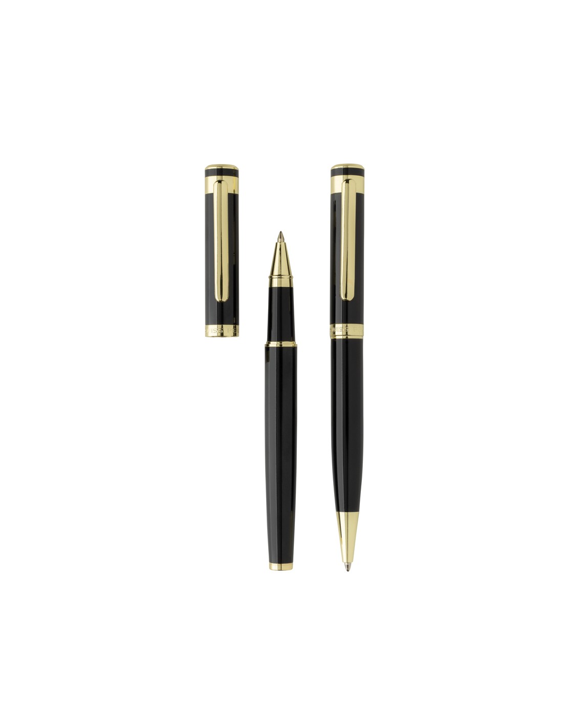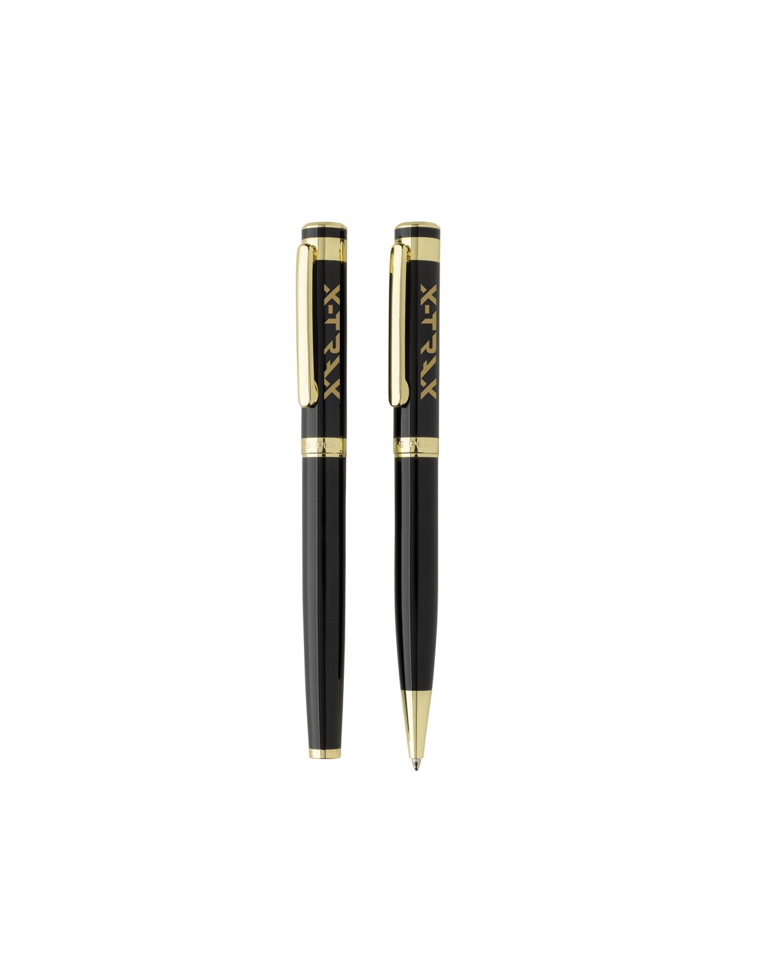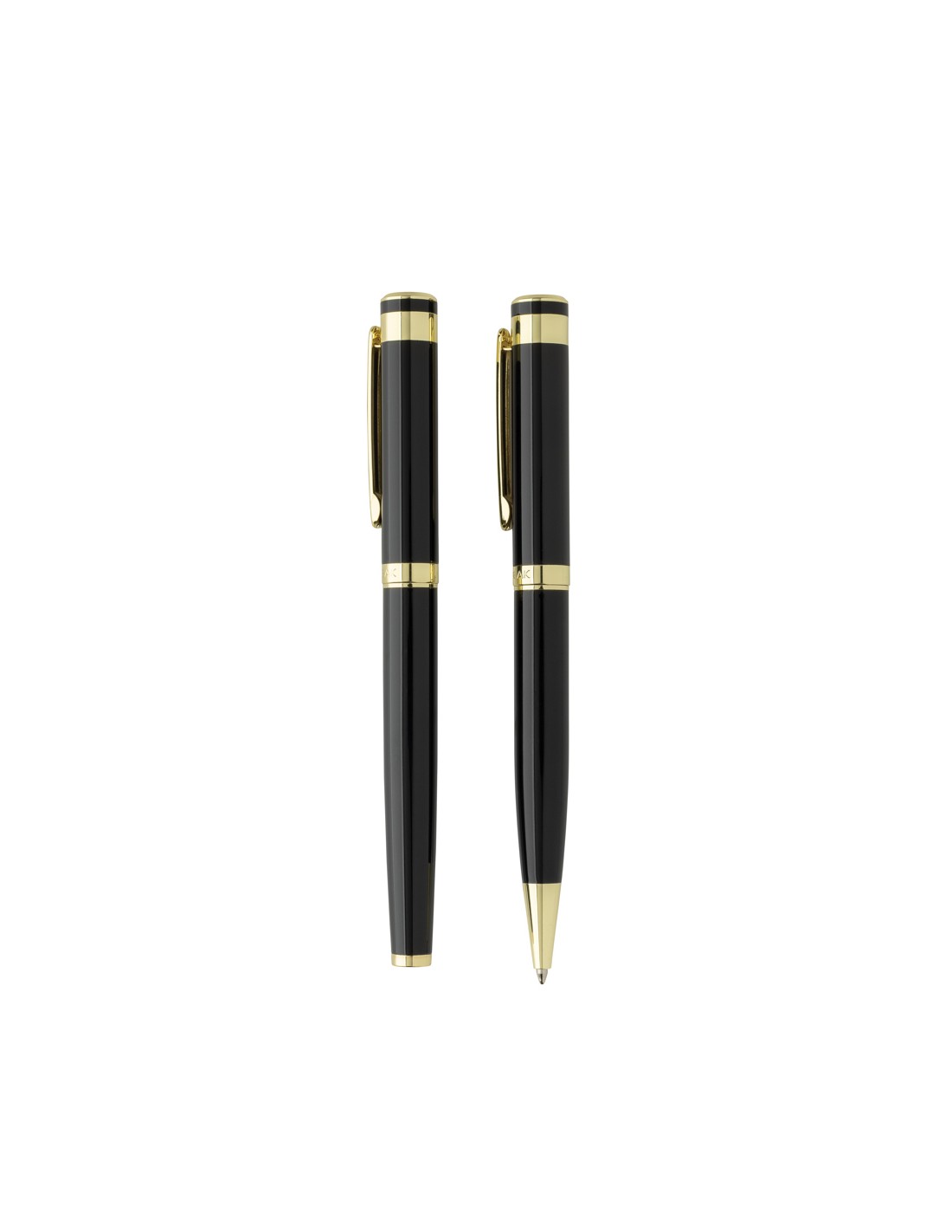 Giv din skriveoplevelse et løft med Swiss Peak Luca RCS genanvendt messing Deluxe Pen Set. Sættet er designet med raffinement for øje og består af slanke sorte kuglepenne med gulddetaljer, herunder den øverste del, den øverste ring, clipsen, den midterste ring og spidsen. Pennene er fremstillet af 55 % RCS certificeret genanvendt messing og er både elegante og ansvarlige. Kuglepennen fungerer med en drejemekanisme og inkluderer en refill med blåt blæk, der skriver 1,0 mm bredt i op til 1200 m. Hættepennen har blåt gelblæk, der giver 800 m glat skrift i samme 1,0 mm bredde. Begge penne har en stålklips og er indgraveret med Swiss Peak logoet på den midterste ring. Sættet præsenteres i en førsteklasses gaveæske og udstråler luksus og stil.
