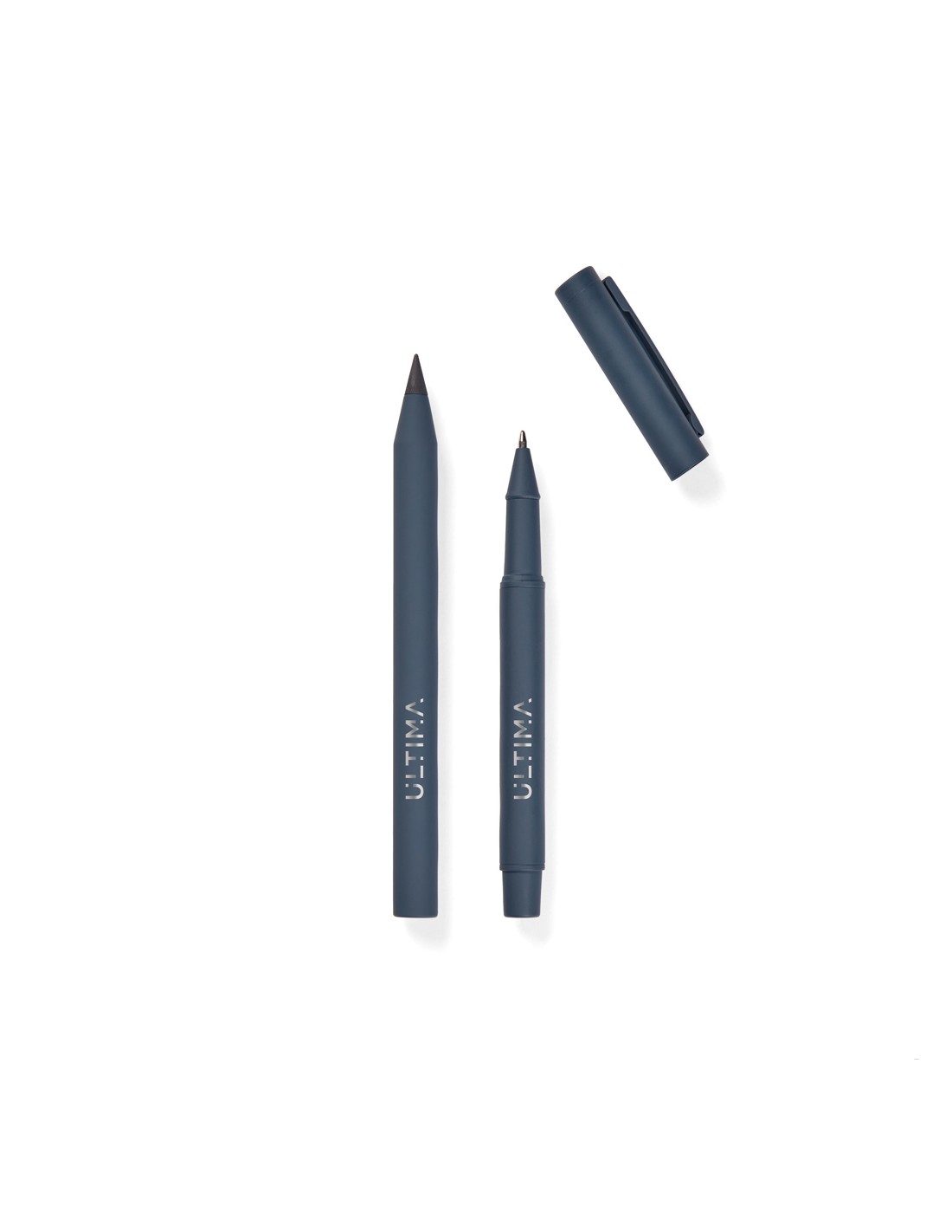 Dette moderne og elegante sæt indeholder to penne: en evighedspen og en klassisk kuglepen med hætte og clips. Pennene er designet til både stil og funktionalitet og er fremstillet af RCS certificeret, genanvendt rustfrit stål med en gummibelægning, der giver et behageligt greb, samt en mat finish. Begge penne har en afbalanceret vægt, der sikrer stabilitet og ubesværet skrivning. Evighedspennen giver ubegrænset skrivning. Kuglepennen har en fin 1,00 mm spids og giver en jævn, ensartet skrivning med blå dokumentblæk, der holder op til 1200 meter. Certificeret af RCS (Recycled Claim Standard), RCS-certificering garanterer, at hele forsyningskæden af genanvendte materialer er certificeret. Det samlede genanvendte indhold er baseret på den samlede produktvægt. Dette produkt indeholder 52 % RCS-certificeret genanvendt aluminium og 10 % RCS certificeret rustfrit stål.