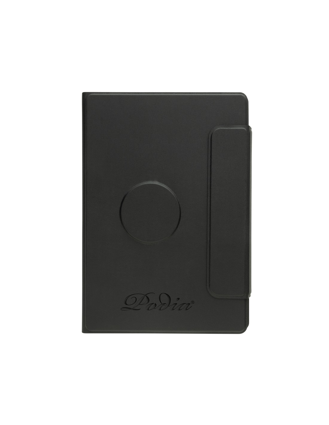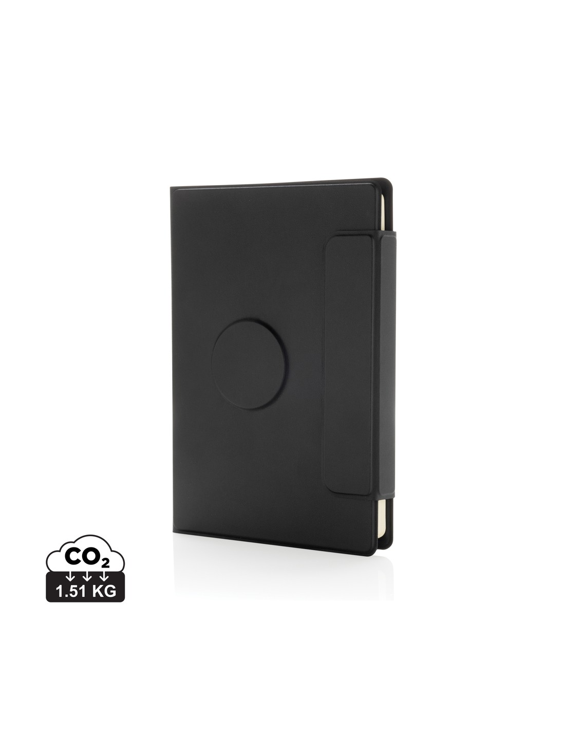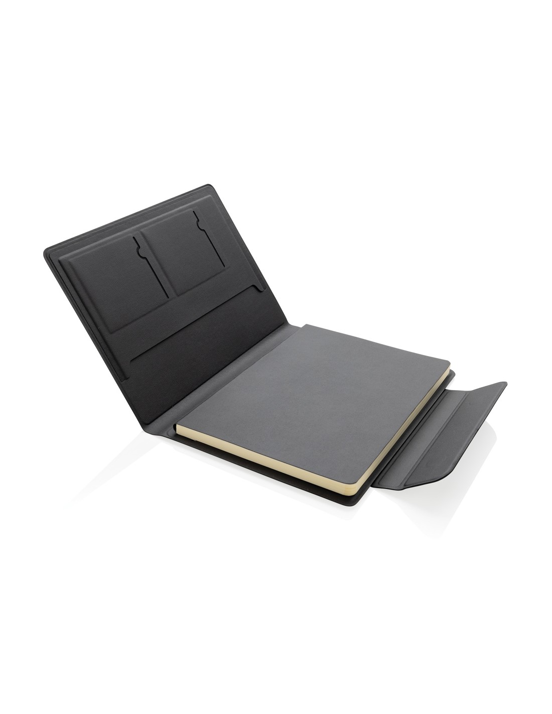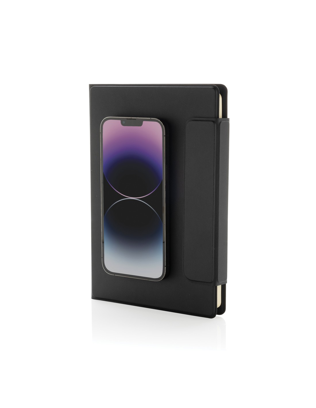 A5 portfolio, genanvendt polyester PU med magnetisk lukning og magnetisk telefonholder, der er kompatibel med magsafe iPhones 12 eller nyere, indvendig A5 notesbog med linjer, indersiderne er FSC®-certificerede og 64 ark/128 sider; cremefarvet papir med linjer; papirvægt 80gsm, dokumentlomme og 2 pladser til visitkort. Notesbogen kan genfyldes.