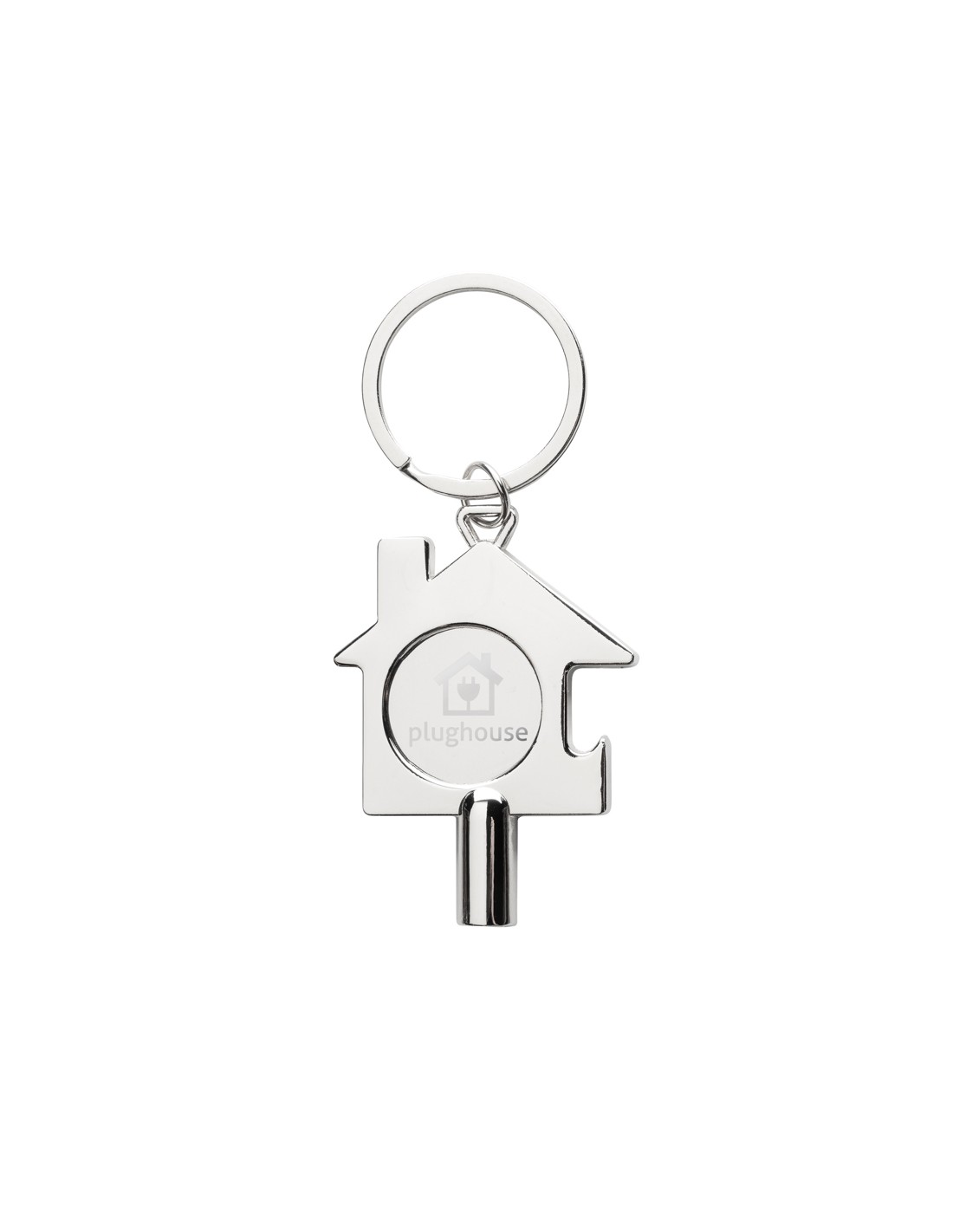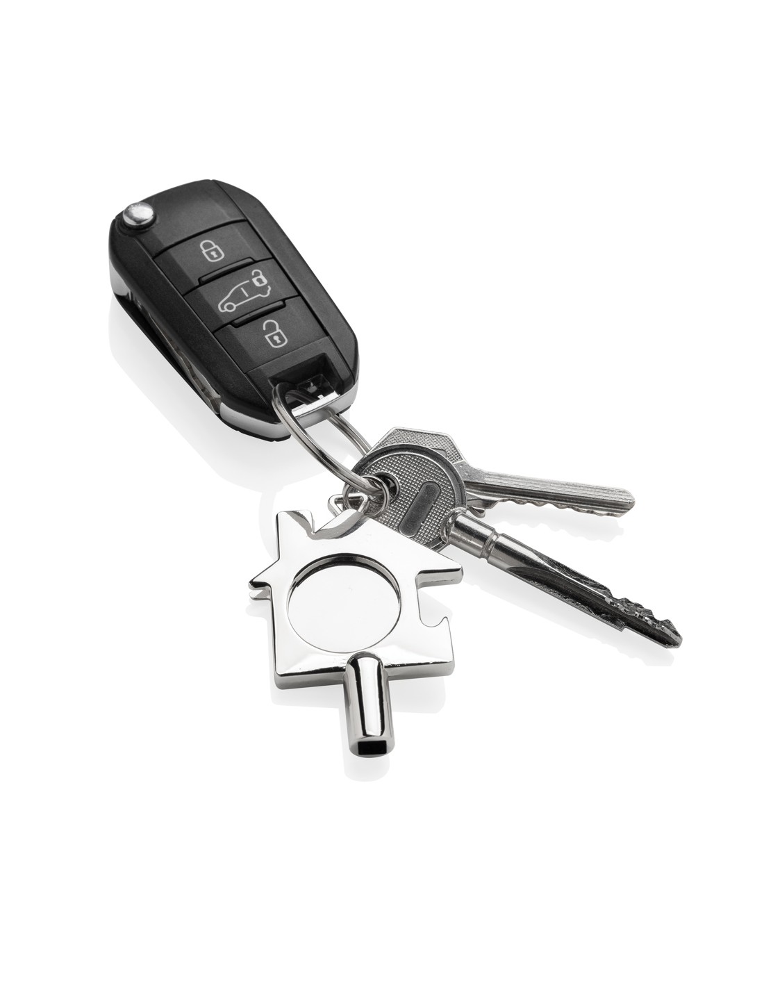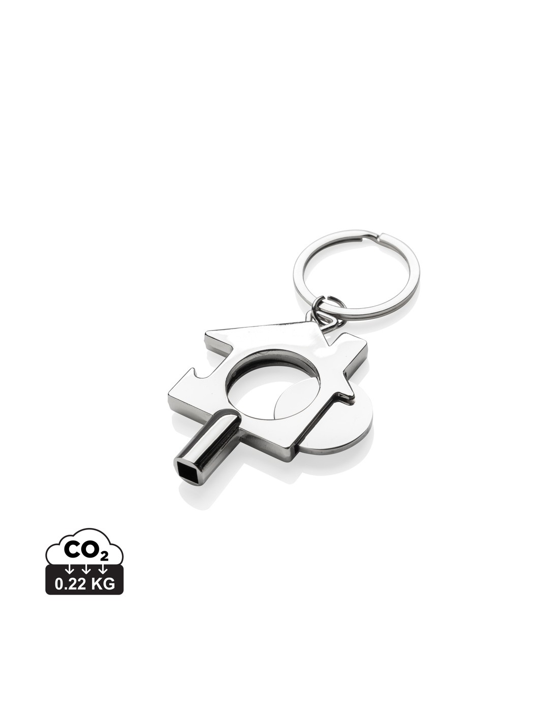 Multifunktionel nøglering med radiatornøgle, indkøbsmønt og stærk oplukker. Fremstillet af RCS-genanvendt zinklegering. Samlet genanvendt indhold: 69% baseret på varens samlede vægt. RCS-certificering sikrer en fuldstændig certificeret forsyningskæde for de genanvendte materialer. Pakket i papirpose. Indkøbsvognsmønten er 2,23 mm tyk, svarende til en 1-euro-mønt.