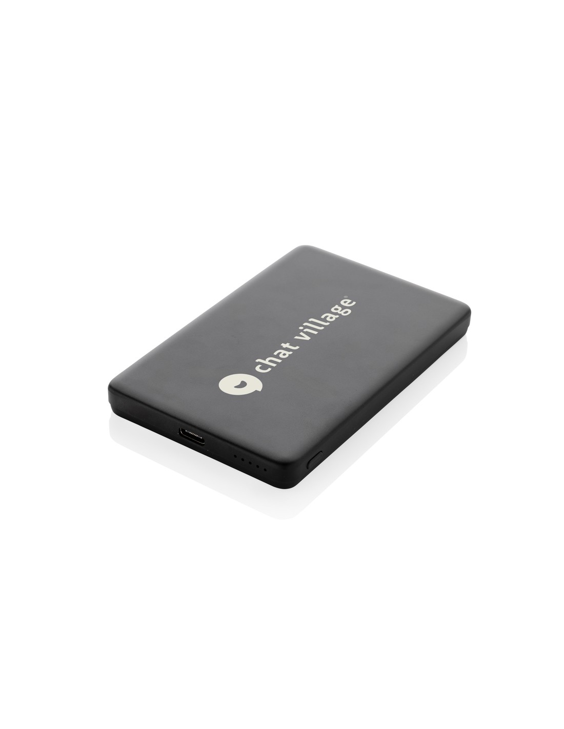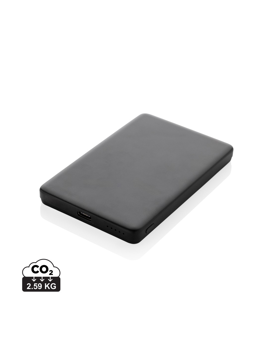 5.000 mAh ultratynd powerbank med 5W magnetisk trådløs oplader, hvor kabinettet er lavet af RCS certificeret genanvendt aluminium og genanvendt ABS plast. RCS (Recycled Claim Standard) er en standard til at verificere det genanvendte indhold i et produkt gennem hele forsyningskæden. Samlet genanvendt indhold: 23 % baseret på varens samlede vægt. Powerbanken indeholder et langtidsholdbart klasse A 5.000 mAh litiumpolymerbatteri. Strømindikatorerne angiver det resterende energiniveau, så du altid ved, hvornår du skal genoplade.; Type-C Input 5V/2.4A; USB C output:5V/2A.4A Vare og tilbehør PVC-fri. Inklusive RCS certificeret opladningskabel af genanvendt TPE. Pakket i FSC®-mix-emballage.