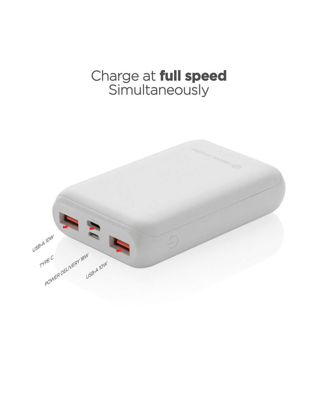 Oplad din telefon op til 2,5 gange, med denne powerbank, til hurtig opladning. Takket være den ultrahurtige type C 18W PD-port, oplades powerbanken igen på rekordtid. Opladning af din telefon op til 50% tager kun 30 minutter. Langsom opladning er noget fra fortiden. Powerbank indeholder et langtidsholdbart A-grade 10.000 mAh batteri til at oplade, dine enheder på dine rejser og eventyr. Den dobbelte USB A- og type C-port giver dig mulighed for at oplade op til 3 enheder på samme tid. Urban Vitamin artikler, er lavet uden PVC og pakket i 100% plastreduceret emballage. Type-C-input: 5V/3A, 9V/2A; Micro USB-indgang: 5V/2A, 9V/2A; Type C-output: 5V/3A, 9V/2A, 12V/1.5A; USB-udgang: 5V/2.4A, 9V/2A, 12V/1.5A