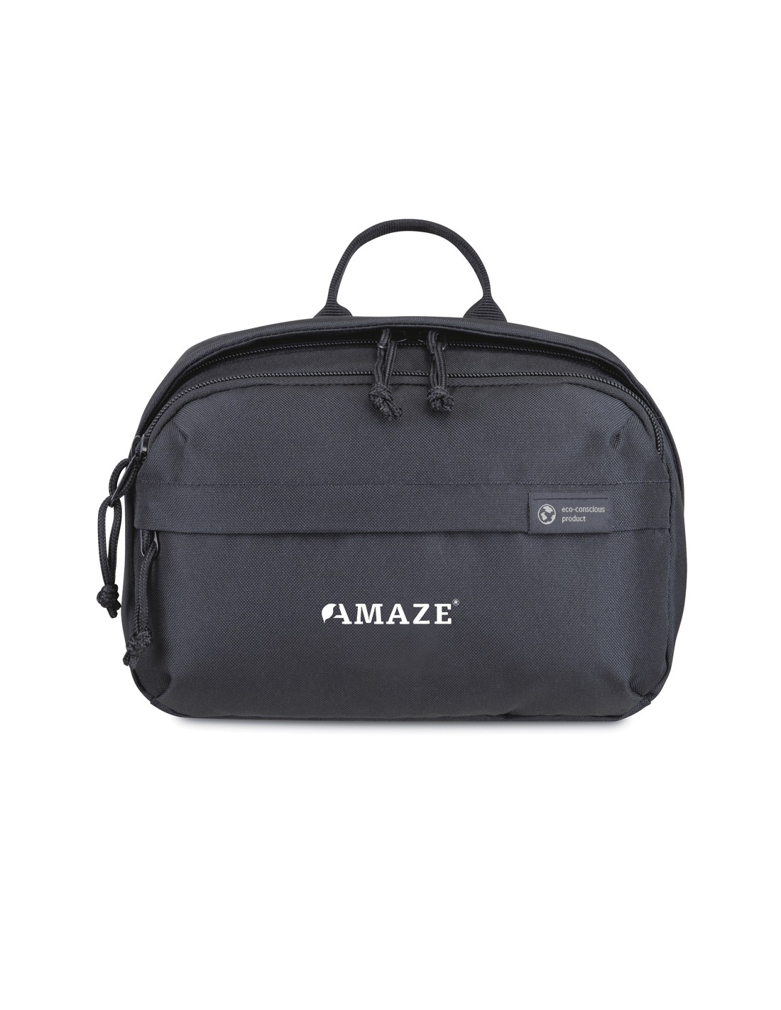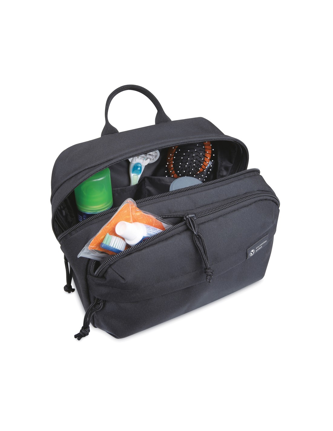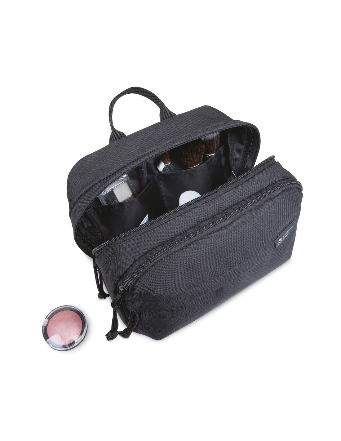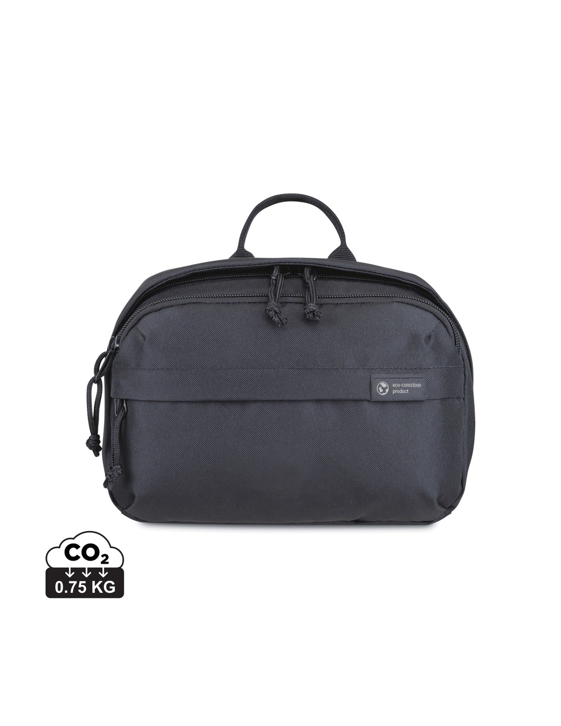 En moderne og bæredygtig opdatering af din toilettaske ved hjælp af genanvendt stof og bånd fremstillet af plastflasker. Lommer med lynlås foran til opbevaring af de vigtigste ting på rejsen. Stort hovedrum med lynlås og indvendige lommer, så du kan holde styr på dine toiletsager. Håndtag i toppen. Fås på begge sider af Atlanten. Denne vare tilbydes også af Gemline til kunder i USA og Canada.