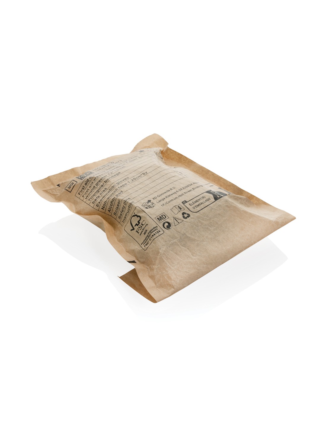 Luksuriøst førstehjælpskit i vandafvisende nubuck-PU-materiale, som både er stilfuldt og praktisk. Materialet er let at rengøre og afviser vand, hvilket gør det perfekt til brug på farten 1 stk PBT-bandage, 1 stk PBT- og kompresbandage, 1 stk trekantbandage, 1 stk safe kiss, 1 par handsker, 1 stk tape, 3 stk nåle, 1 stk saks, 10 stk plastre og 4 stk spritpuder; ; Alt indhold i henhold til direktiverne om medicinsk udstyr: 93/42/EØF og EU (2017/745), EN ISO 13485:2016; Alt indhold (undtagen nåle og saks) pakket i papirpose mærket med alle obligatoriske markeringer, der er nødvendige for EU, som "Udløbsdato, CE, LOT-nummer.Samlet genanvendt indhold: 24 % baseret på varens samlede vægt. RCS certificering sikrer en fuldstændig certificeret forsyningskæde for de genanvendte materialer.