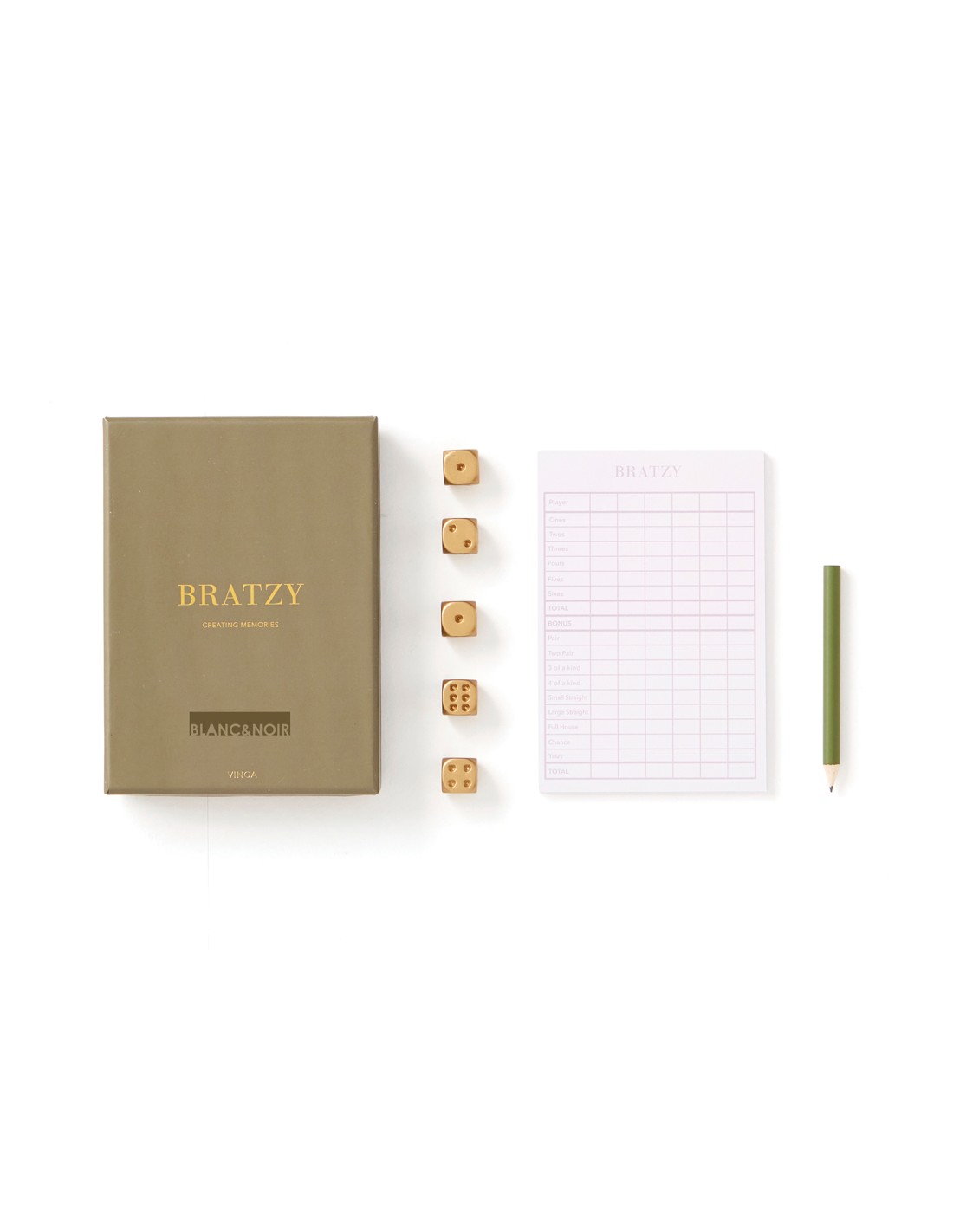 Dette er Yatzy i en luksusforklædning! Med gyldne terninger, og en tilsvarende eksklusiv blyant, har vi opgraderet Yatzy til Bratzy. Dette spil leveres i en elegant æske, trykt med gyldne bogstaver, der både gør det egnet til at give i gave og bruge det som en fin detalje på sofabordet.
