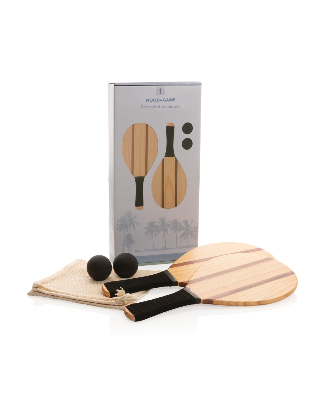 Luksus frescobol spil, perfekt til spil på stranden, park eller på din ferie. Lavet af stærkt og varigt fyrretræ blandet med Sapele træ. Træmønsteret kan være anderledes pr. ketcher. Medfølger to bolde af høj kvalitet. Med ekstra behageligt greb for perfekt kontrol. Bomulds pose til at opbevare sættet under transport til din favorit strand eller park.