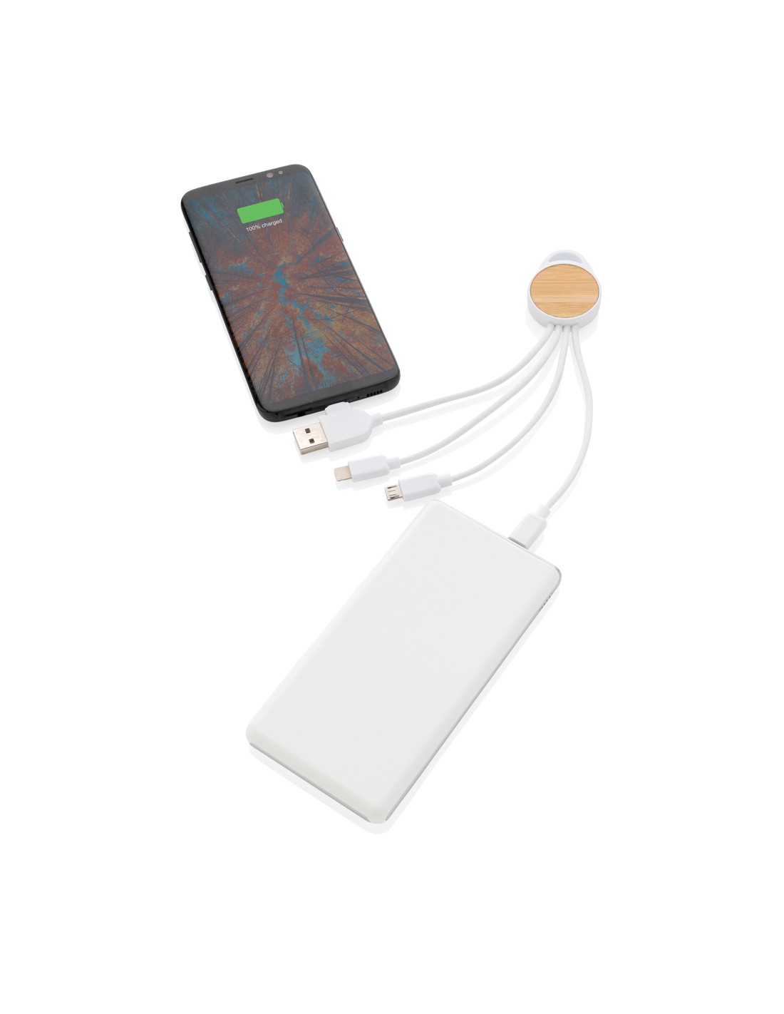 Kompakt og nem at medtage multikabel, lavet med certificerede genbrugsmaterialer. Leveres med 5 forskellige stik: USB C i, USB A i, type C ud, IOS ud og micro USB ud. Dette giver dig mulighed for at bruge kablet også med type C udgangs enheder, der er inkluderet i den nyere generation af telefoner og MacBook computere. Kablet har også en USB A udgang/indgangs mulighed, så det kan oplade enhver enhed fra enhver udgangskilde. Kabinet lavet af FSC®bambus og 100% RCS certificerede genanvendte ABS kabler fremstillet af 100% RCS certificeret RCS TPE materiale. Total genanvendt indhold: 82% baseret på den total artikel vægt. Maks. kabellængde: 20 cm. Pakket i FSC® blandet kraft omslags emballage. PVC fri.
