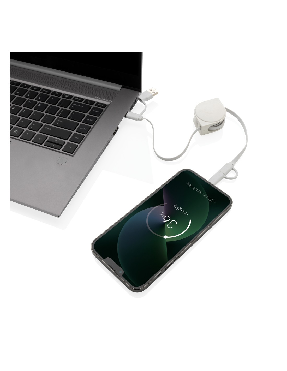 6 i 1 udtrækkeligt kabel, hvor kabinettet er lavet af RCS-certificeret genanvendt ABS-plast og ledningen af genanvendt TPE. RCS (Recycled Claim Standard) er en standard til kontrol af genanvendt indhold i et produkt i hele forsyningskæden. RCS er den standard, der bruges, når en del af varen er fremstillet af genbrugsmaterialer. Total genanvendt indhold: 59%, baseret på total vægt. Med 5 forskellige stik: USB C indgang, USB A indgang, type C udgang, IOS ud og mikro USB udgang. Dette giver dig mulighed for at bruge kablet også med type C udgangs enheder, der findes i den nyere generation af telefoner og MacBook computere. Kablet har også en USB A-udgang/indgangs indstilling, så den kan oplade enhver enhed fra enhver udgangskilde. Varen er komplet PVC-fri.