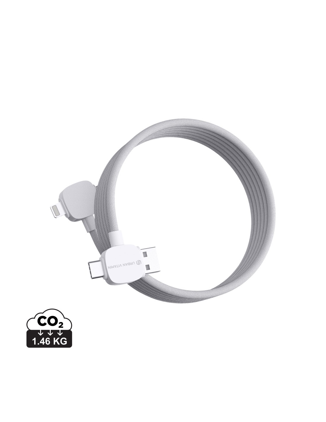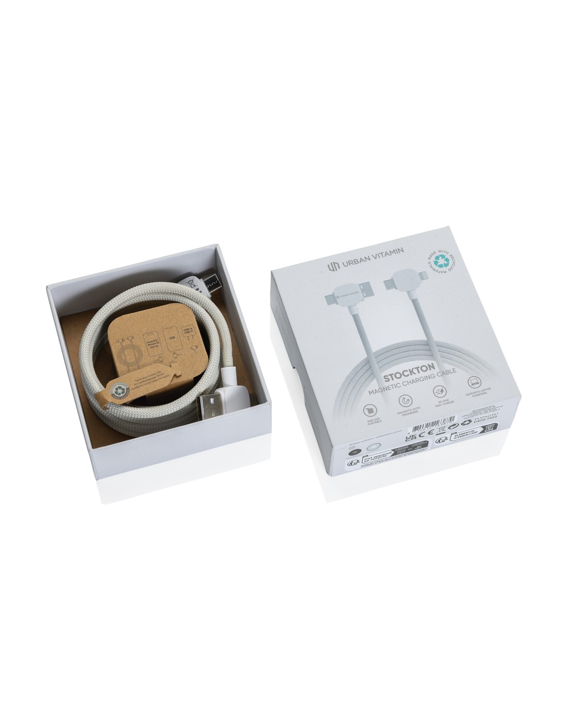 Det ultimative 120 cm magnetiske opladningskabel til problemfri tilslutning og uovertruffen bekvemmelighed! Sig farvel til sammenfiltrede kabler med Stockton, der er designet til at revolutionere din ladeoplevelse. Dets magnetiske design forenkler kabelorganiseringen, forhindrer sammenfiltrede kabler og er mobilt, så du kan have det med overalt. Stockton passer til din livsstil på farten og tilbyder både USB Type-C- og USB-A-indgange, hvilket sikrer kompatibilitet med forskellige enheder. Med iOS- og Type-C-udgange er det alsidigt nok til at oplade din iPhone, Android-enhed eller laptop! Stockton er ikke bare et opladningskabel; det er din løsning til problemfri dataoverførsel, lynhurtig synkronisering af filer, fotos og musik mellem enheder. Med en robust opladningskapacitet på 65 W er det en game-changer for både mobile enheder og bærbare computere. Stockton er fremstillet af RCS-certificeret (Recycled Claim Standard) genanvendt ABS. Samlet genanvendt indhold: 55 % baseret på varens