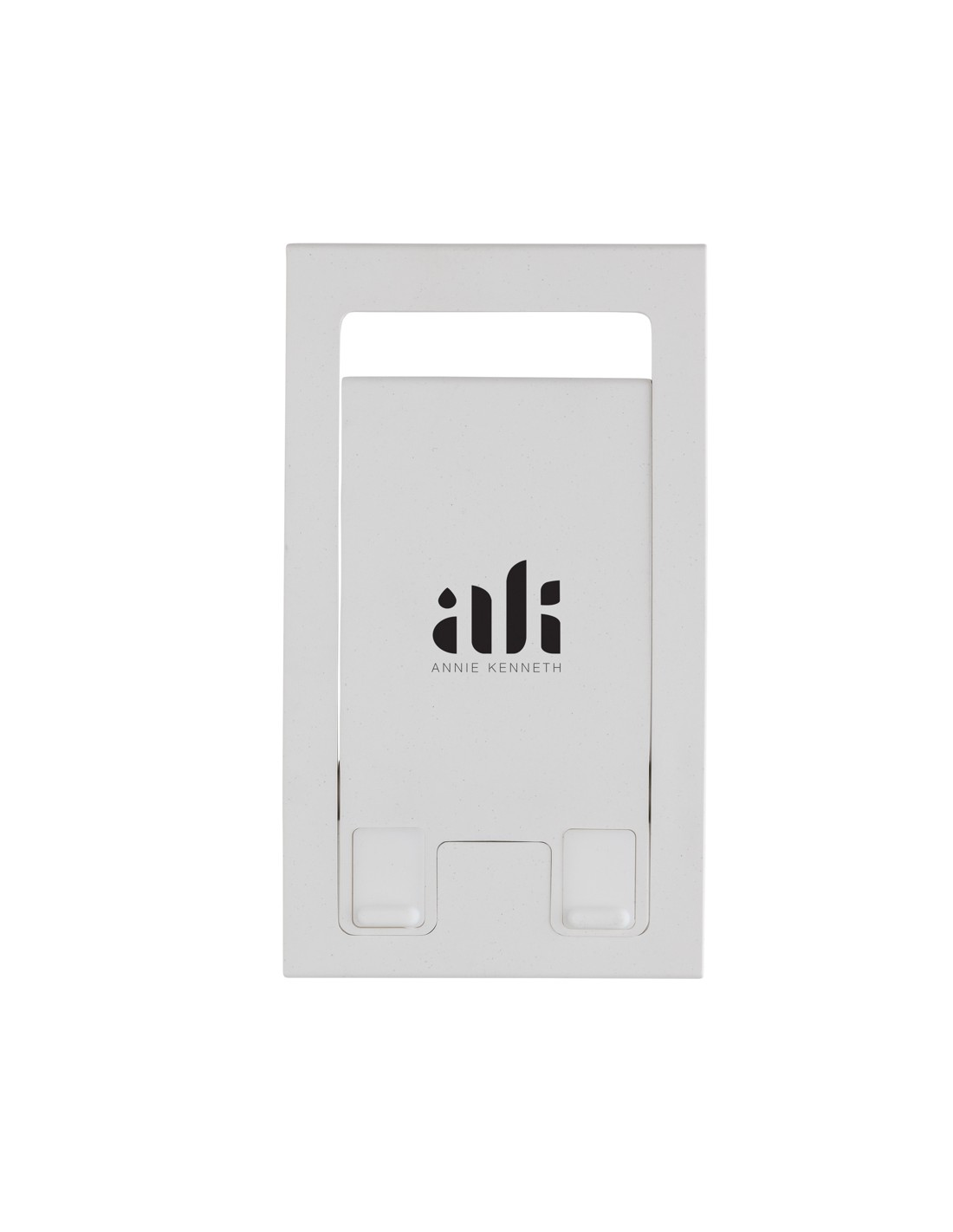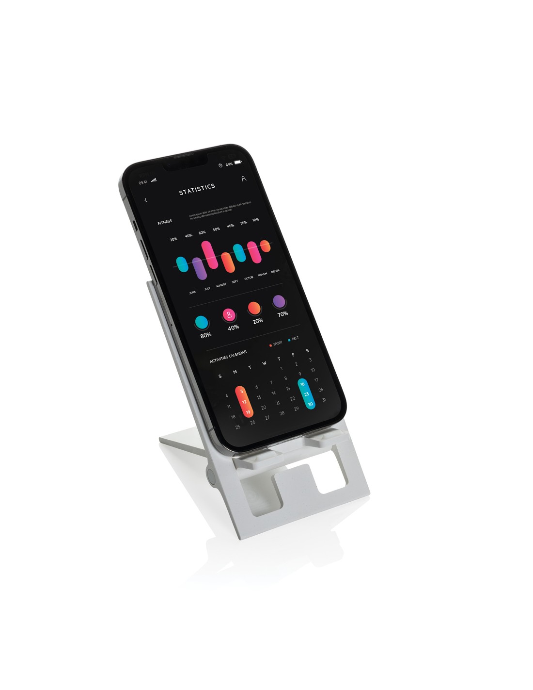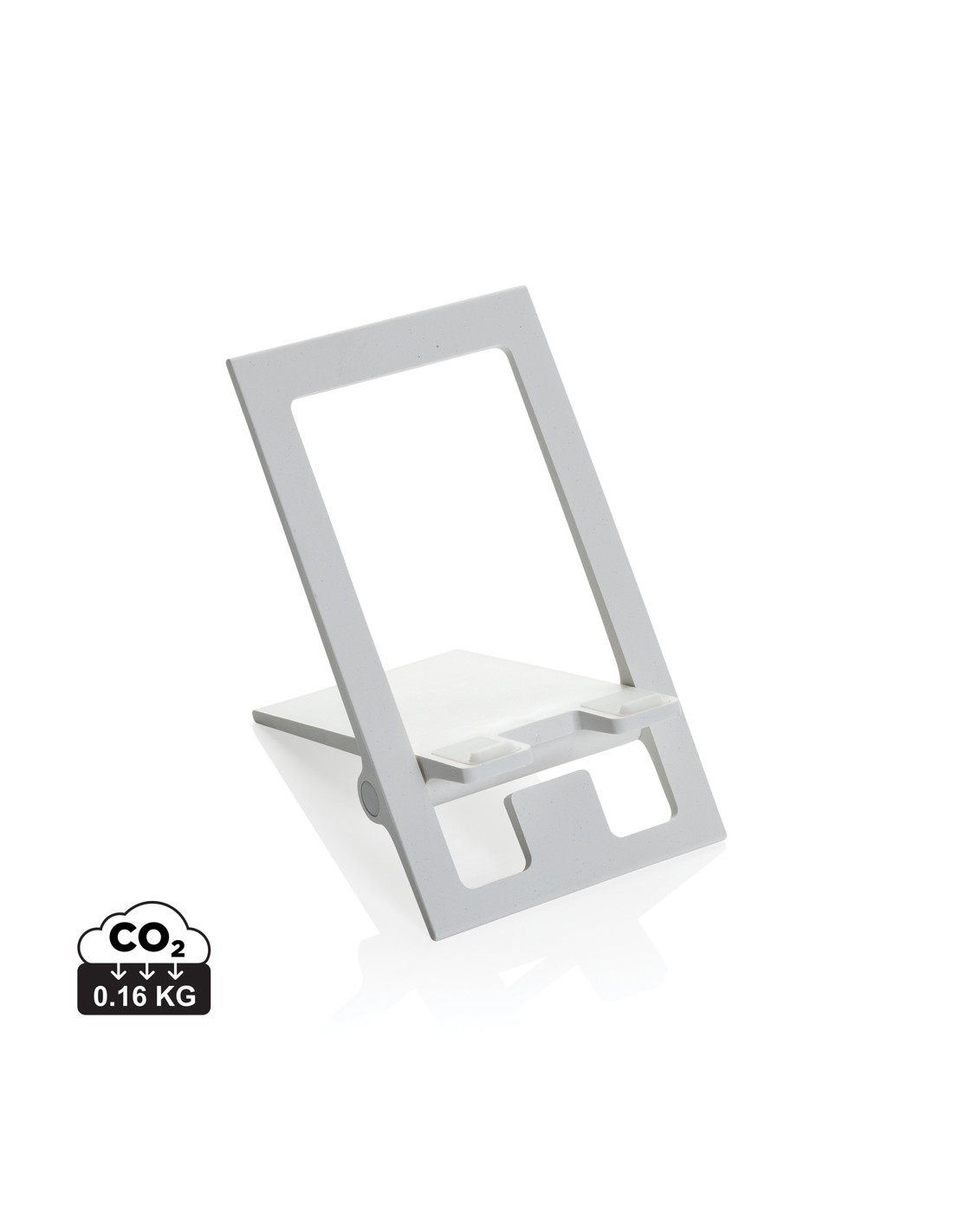 Fladt og sammenklappeligt telefonstativ fremstillet af RCS-genanvendt ABS. Stativet leveres fladt og sammenfoldet og kan foldes ud til et telefonstativ, der kan holde alle størrelser telefoner. Stativet er stærkt nok til at justere synsvinklen. Med silikonepude for at holde din telefon i optimal kondition. Samlet genanvendt indhold: 85 % baseret på varens samlede vægt. RCS-certificering sikrer en fuldstændig certificeret forsyningskæde for de genanvendte materialer. Pakket i FSC®-emballage. Fri for PVC.