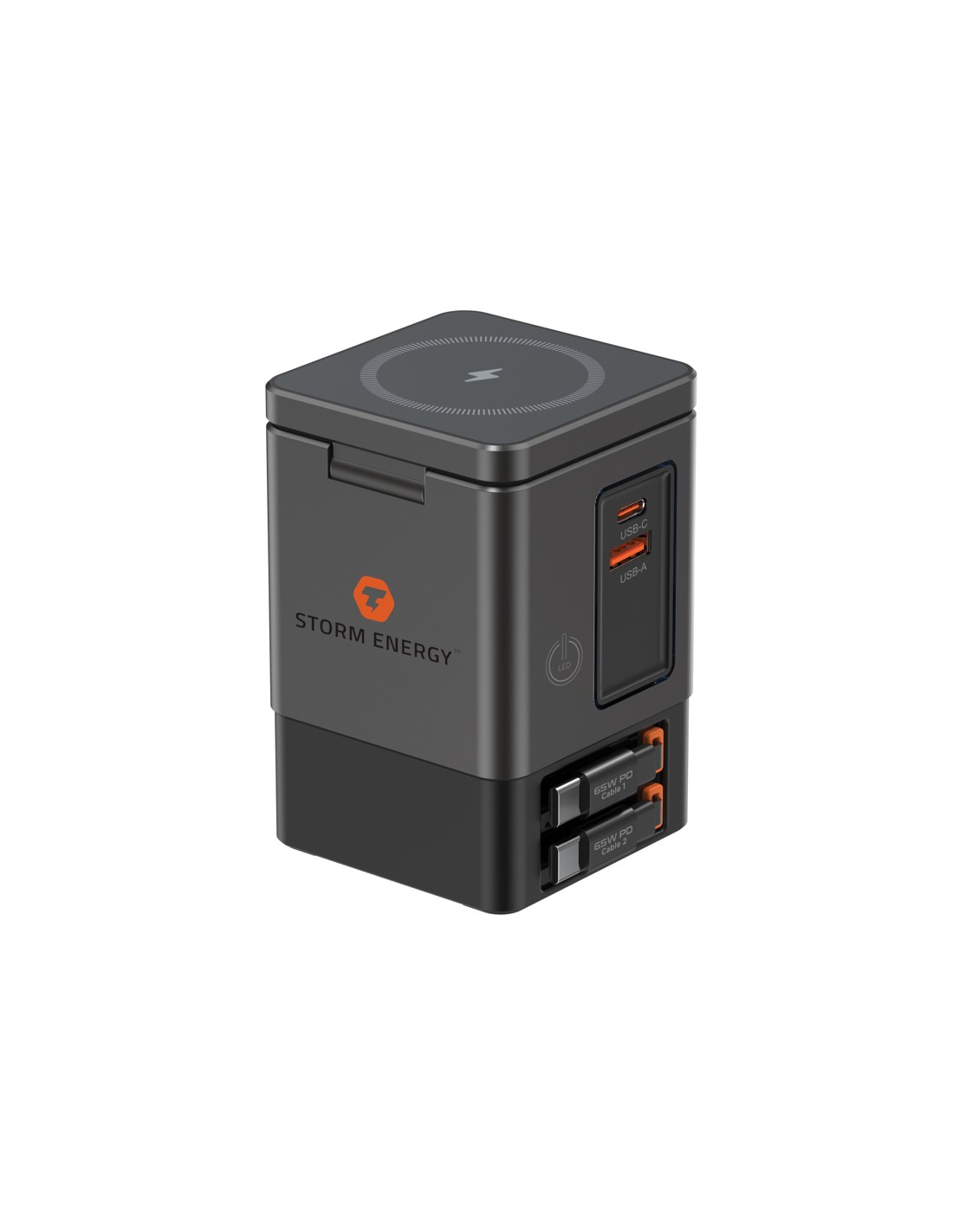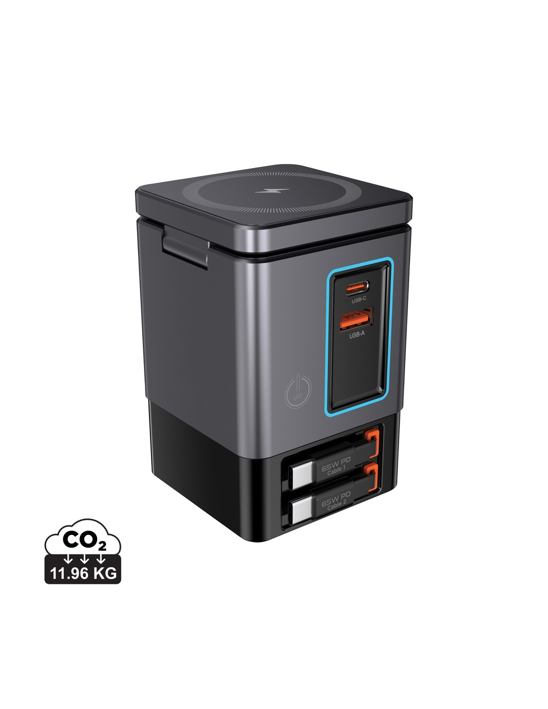 65 W USB-C kabler, så du altid har hurtig opladning lige ved hånden – uden ekstra kabler. Brug for flere muligheder? Sacramento har også en USB-A- og USB-C-port, så du har i alt fire udgangsmuligheder til at oplade bærbare computere, tablets, smartphones og mere – alt på én gang. Og til dine trådløse enheder er Sacramento udstyret med en kraftig 15W magnetisk trådløs oplader, der holder din telefon sikkert på plads, samt en separat trådløs pad, der er specielt designet til mindre genstande som øretelefoner eller AirPods (maks. 5W). Sacramento leverer høj ydeevne med et kompakt, effektivt design – der producerer mindre varme og bruger energi mere effektivt end traditionelle opladere. Sacramento er fremstillet af RCS-certificeret (Recycled Claim Standard) genanvendt brandsikkert PC. Samlet genanvendt indhold: 26 % baseret på den samlede vægt af produktet.