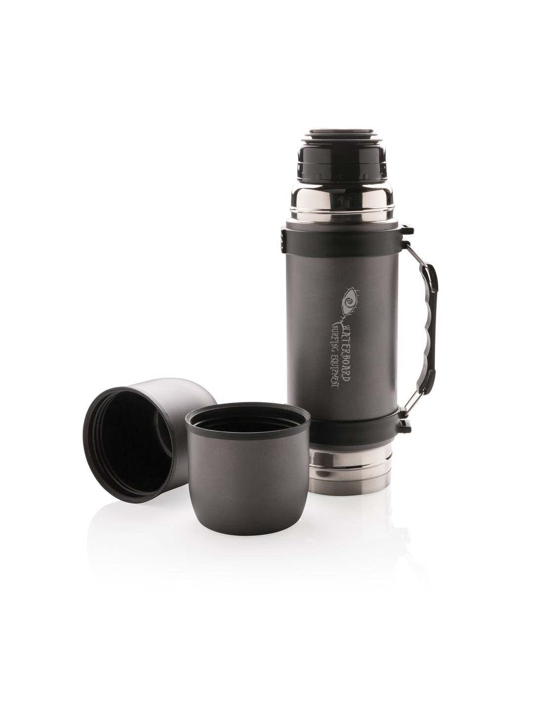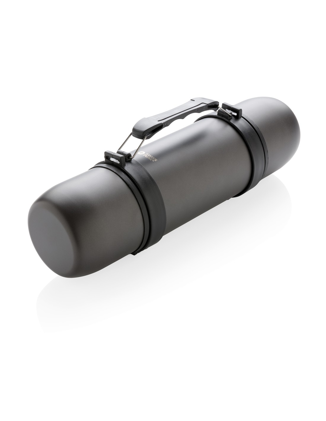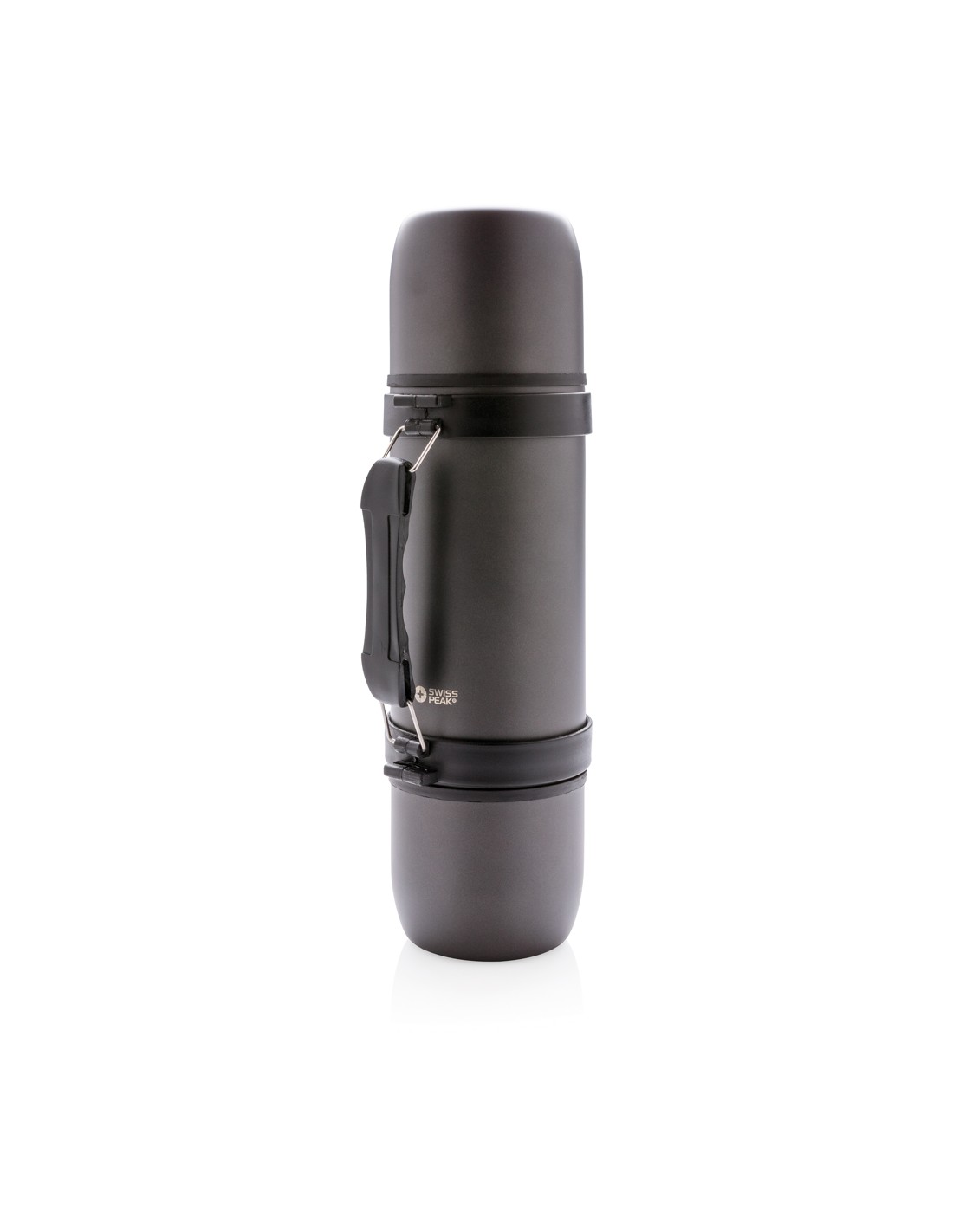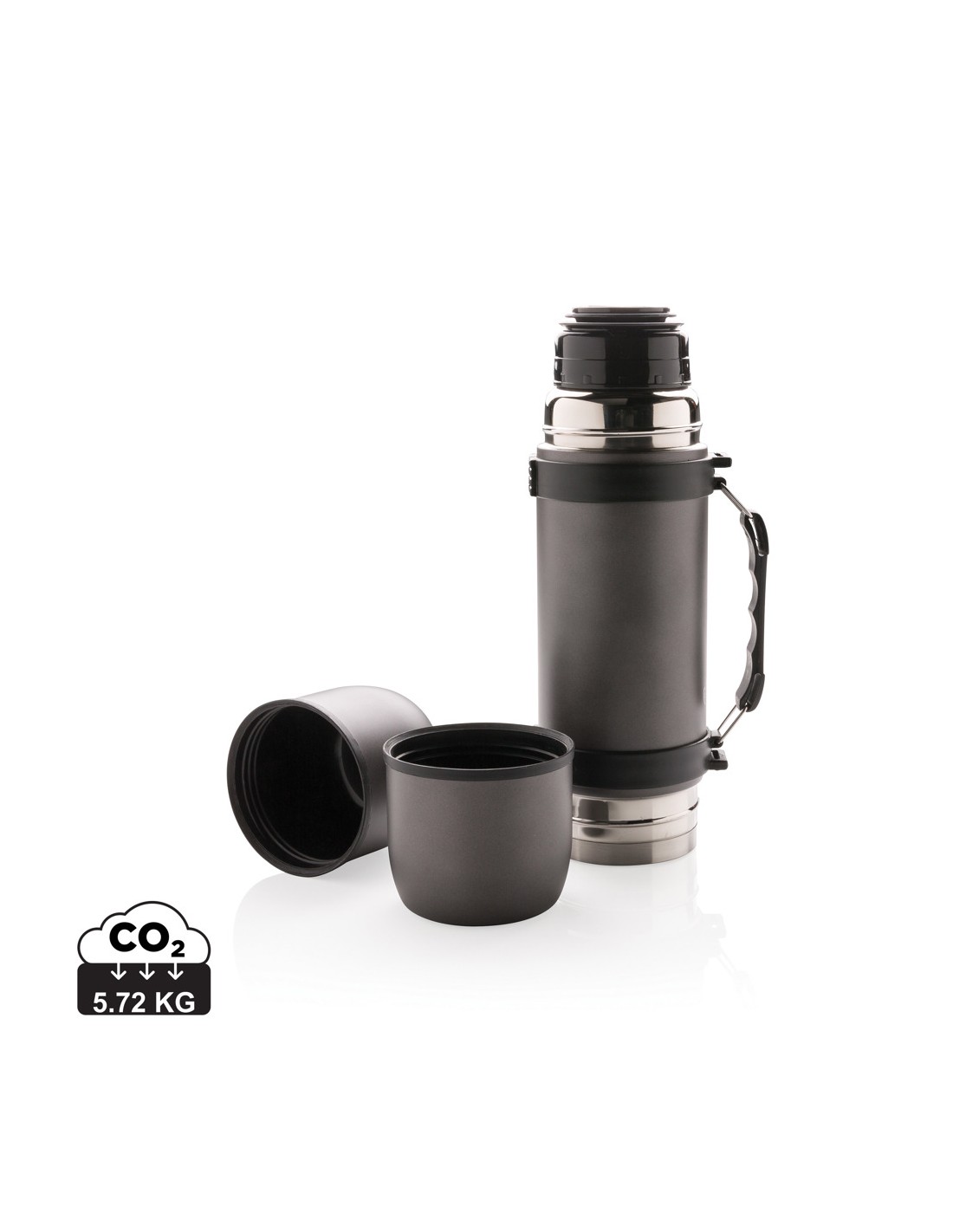 Rustfrit stål, dobbeltvægget vakuum flaske i elegant design med greb og skulderstrop. 2 matchende krus. Spildsikker, tåler kun håndopvask. Indhold 700 ml.