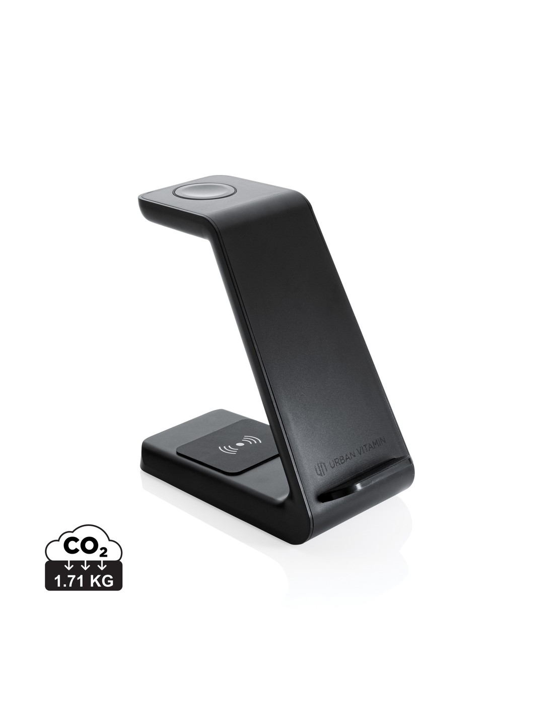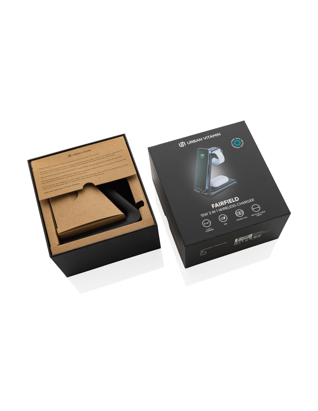 15W 3 i 1 trådløs oplader lavet med RCS (Recycled Claim Standard) certificeret genanvendt ABS. Samlet genanvendt indhold: 60% baseret på samlet artikelvægt. RCS-certificering sikrer en fuldstændig certificeret forsyningskæde af de genanvendte materialer. Denne trådløse oplader, oplader din telefon på den hurtigst mulige måde. Opladeren er udstyret med en dual coil 15W trådløs oplader: 10W trådløs oplader bagpå og ovenpå en 3W iWatch oplader. Inklusive 120 cm type C ladekabel fremstillet af RCS certificeret genanvendt TPE. Urban Vitamin-artikler fremstilles uden PVC og pakkes i plastreduceret emballage. Indgang: 5V/3A, 9V/2A 5V/1A, 9V /1.1A
