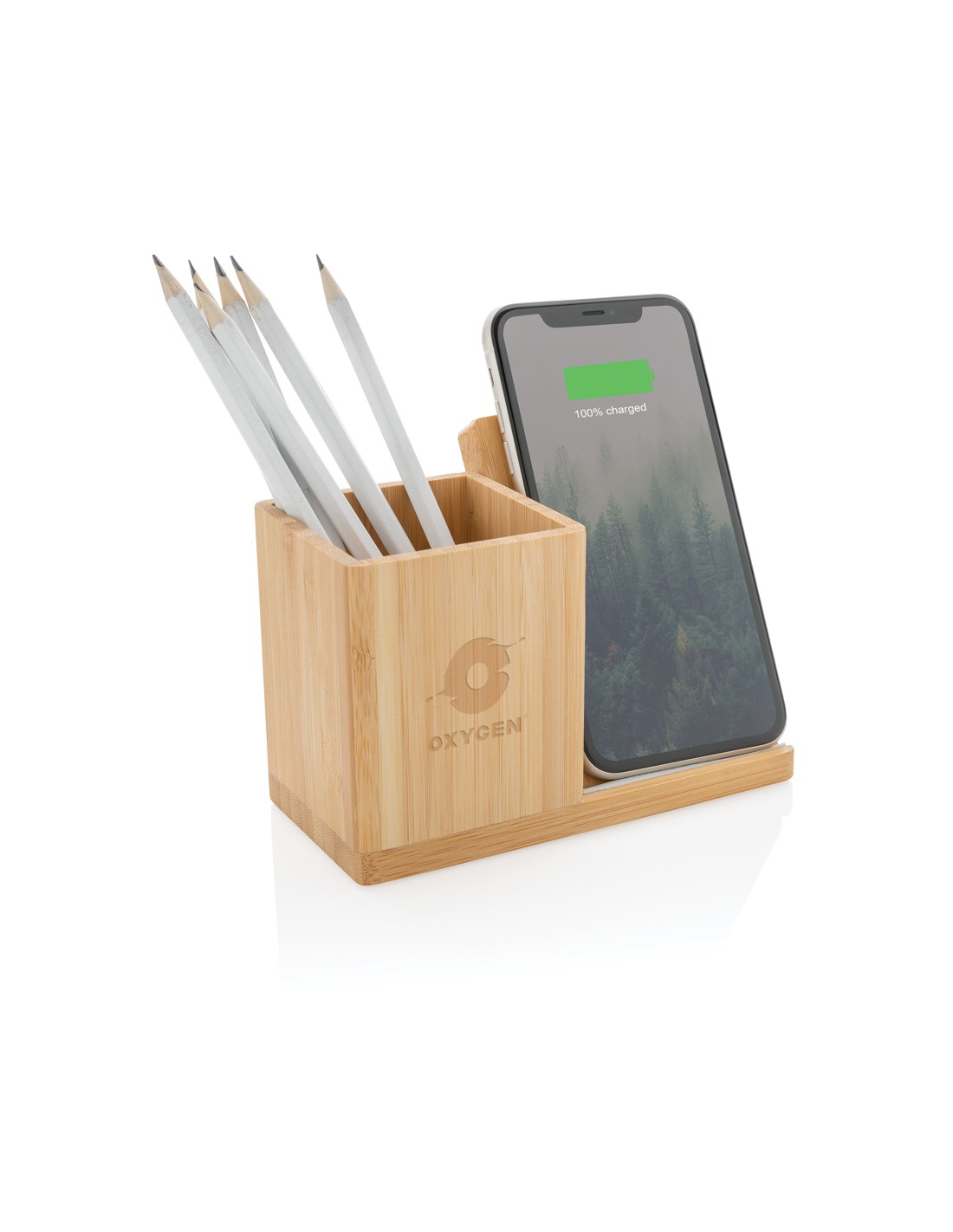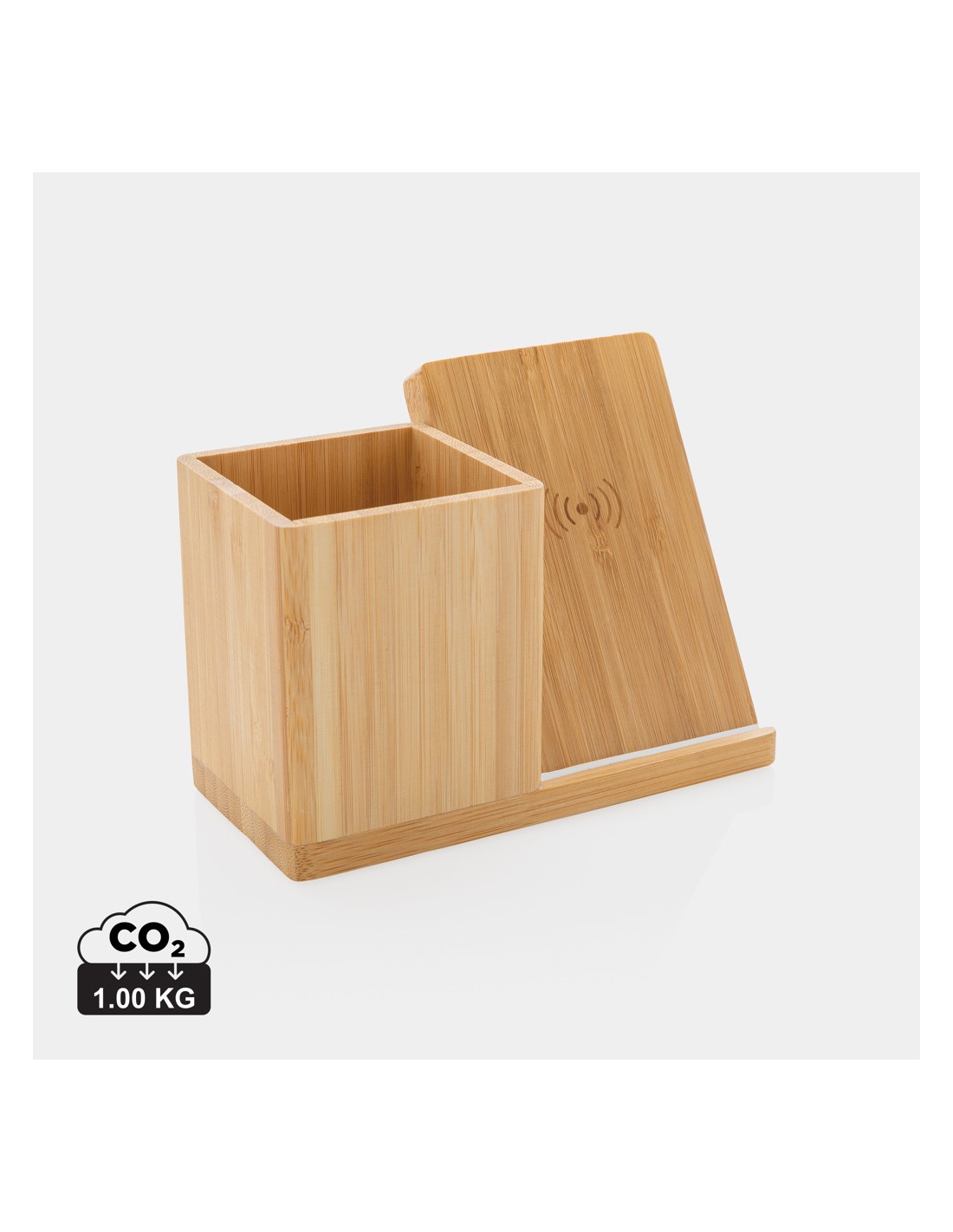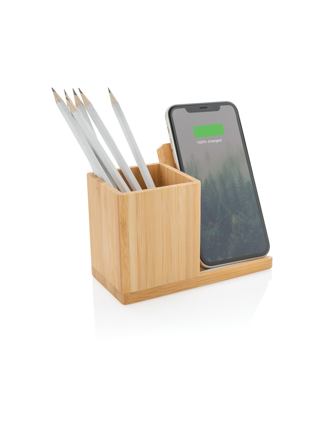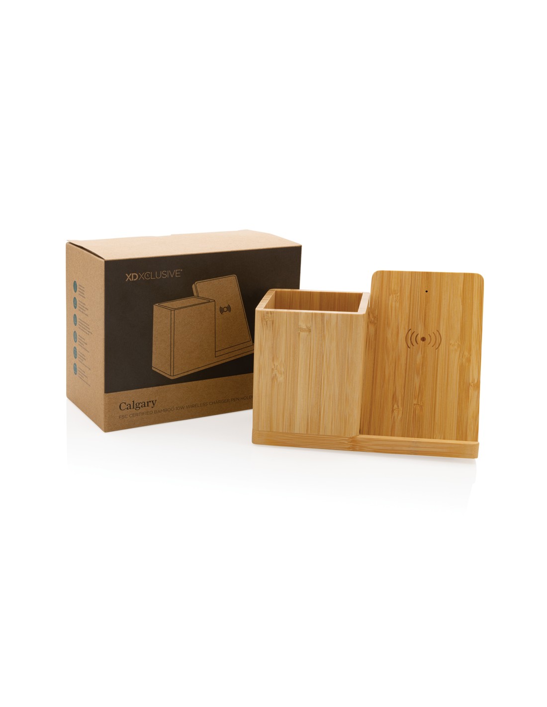 10W trådløs hurtigoplader med penne holder lavet med RCS (Recycled Claim Standard) certificeret genanvendt ABS. Samlet genanvendt indhold: 6% baseret på samlet artikelvægt (inklusive bambusbase) Arrangørens bambus udvendige er fuldt fremstillet af FSC 100 bambus. Inklusive 120 cm type C ladekabel fremstillet af RCS certificeret genanvendt TPE. Pakket i FSC mix kraftboks. Type-C indgang 5V/2A; 9V/1,67A. Trådløs udgang 5V/1A;9V/1.1A (10W) Registreret design®