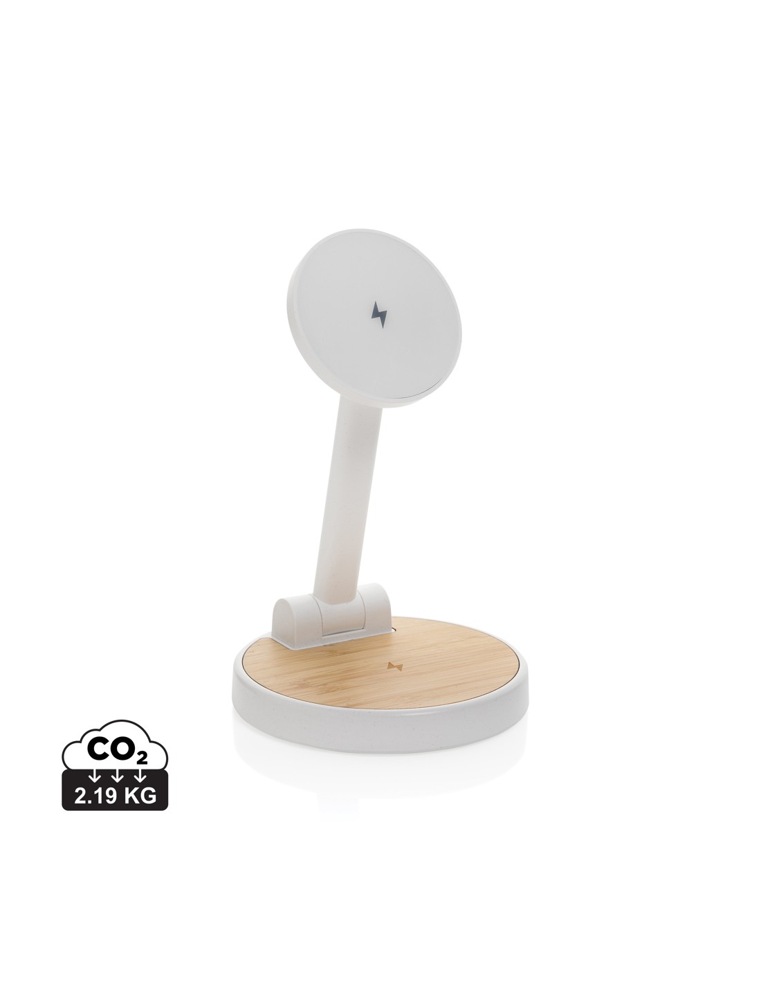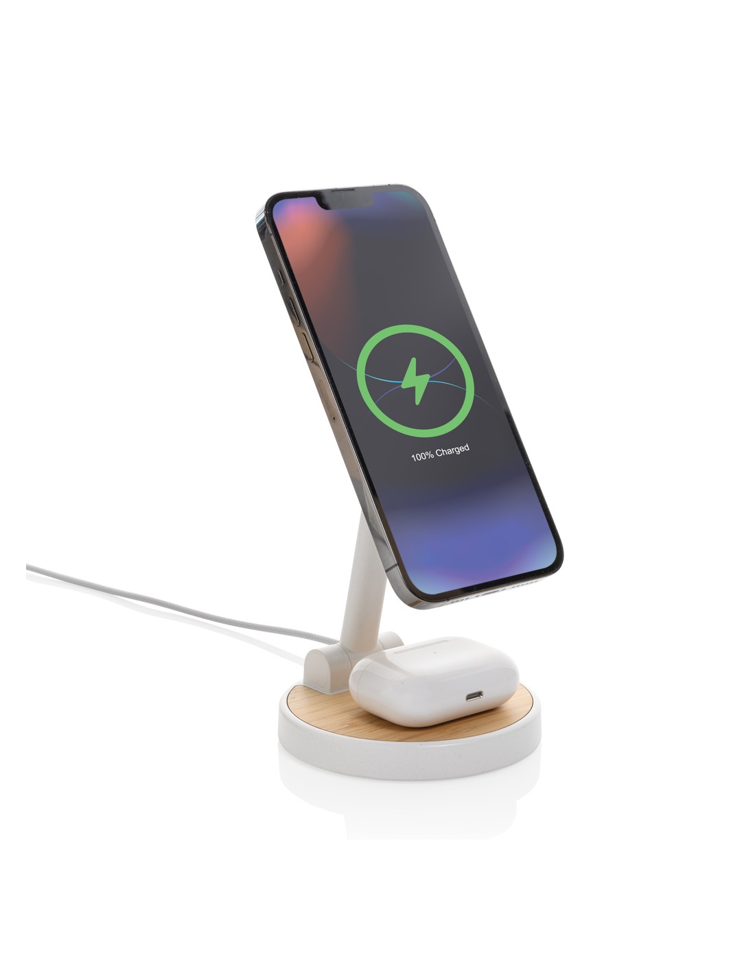 15W 2-i-1 hurtig trådløs oplader med magnetisk opladning lavet af RCS (Recycled Claim Standard) certificeret genanvendt ABS. Samlet genanvendt indhold: 30% baseret på varens samlede vægt. RCS-certificering sikrer en fuldstændig certificeret forsyningskæde for de genanvendte materialer. Trådløst opladningsområde i bambus fremstillet af FSC 100% bambus. Med magnetisk 15W-oplader og en 5W-oplader til andre trådløse produkter, der kan oplades, f.eks. øretelefoner. Med en USB A-port til at oplade enheder via kabel. Vare og tilbehør er PVC-fri. Inklusive 120 cm type C-opladerkabel fremstillet af RCS-certificeret genanvendt TPE. Pakket i FSC-mix kraftboks. 9V/3A; W: 9V/1,1A; 9V/1,67 A/(15W), Øretelefoner: 5V/1A (5W), USB-udgang 5V/2,1A. PVC-fri.