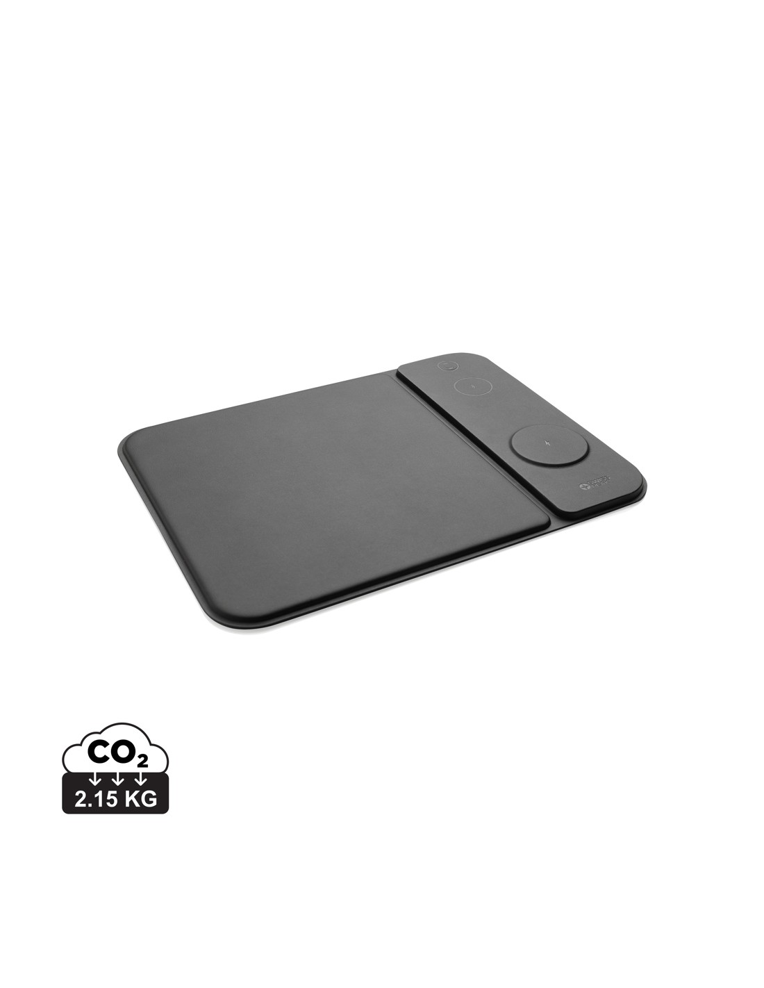 Luksus 3-i-1 trådløs oplade musemåtte lavet med RCS-genanvendt ABS og RCS genanvendt PU. Samlet genanvendt indhold: 5 % baseret på varens samlede vægt. RCS-certificering sikrer en fuldstændig certificeret forsyningskæde for de genanvendte materialer. Den trådløse oplader er udstyret med en magnetisk 15W trådløs oplader og en ekstra 5W trådløs oplader, der passer til etuier til øretelefoner eller andre små enheder, der kan oplades trådløst, og en 2,5W trådløs oplader til smartwatches (kun Apple-ure). Inklusive RCS-certificeret 120 cm genanvendt TPE-kabel. Pakket i FSC®-mix-emballage. Vare og tilbehør er 100 % PVC-fri. Indgang: 9V/3A for optimal brug. Udgang: Telefon: 9V/1,1A; 9V/1,67 A/(15W), øretelefoner: 5V/1A (5W), Ur: 5V/0,5A.