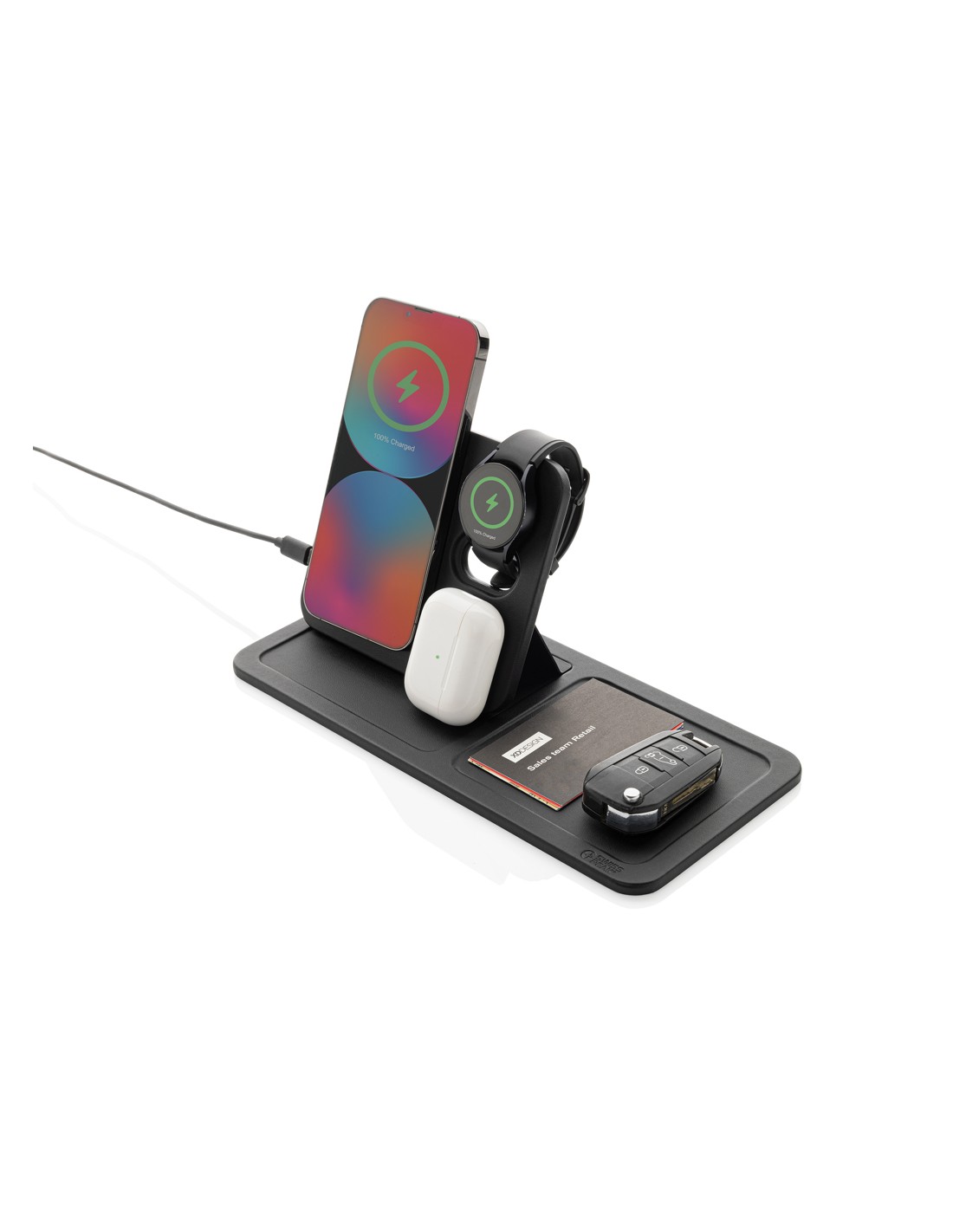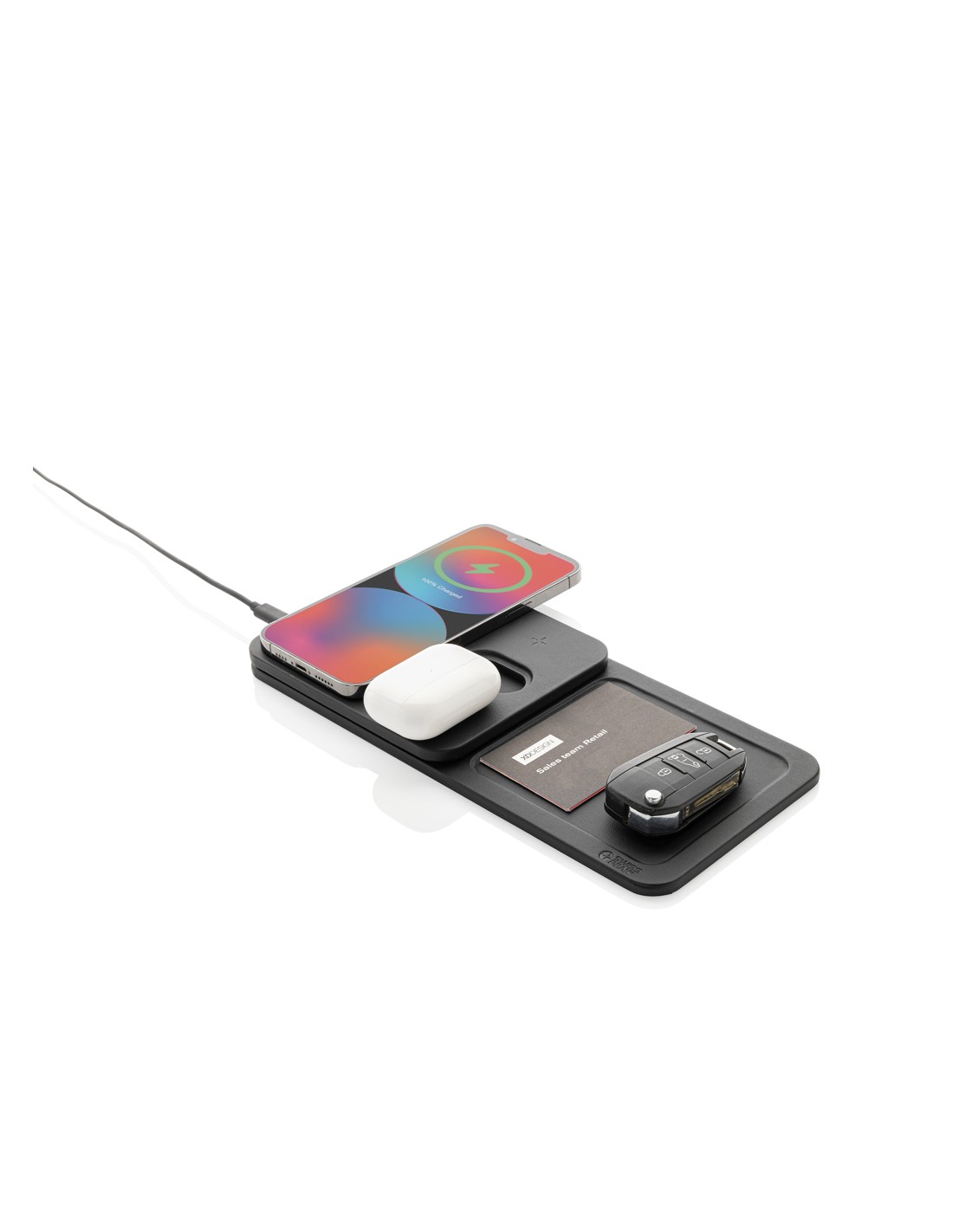 Luksuriøs og sammenklappelig 3-i-1 trådløs oplader med skrivebordsbakke fremstillet af RCS genanvendt PU.Samlet genanvendt indhold: 5% baseret på varens samlede vægt. RCS certificering sikrer en fuldstændig certificeret forsyningskæde for de genanvendte materialer. Den trådløse oplader er udstyret med en magnetisk 15W trådløs oplader og en ekstra 5W trådløs oplader, der passer til etuier til øretelefoner eller andre små enheder, der kan oplades trådløst, og en 2,5W trådløs oplader til smartwatches (kun Apple-ure). Inklusive 120 cm TPE-kabel. Pakket i FSC®-mix-emballage. Vare og tilbehør er 100 % PVC-fri. Minimum input: 9V/3A for optimal brug. Udgang: Telefon: 9V/1,1A; 9V/1,67 A/(15W), Ørepropper: 5V/1A (5W), Ur: 5V/0,5A.