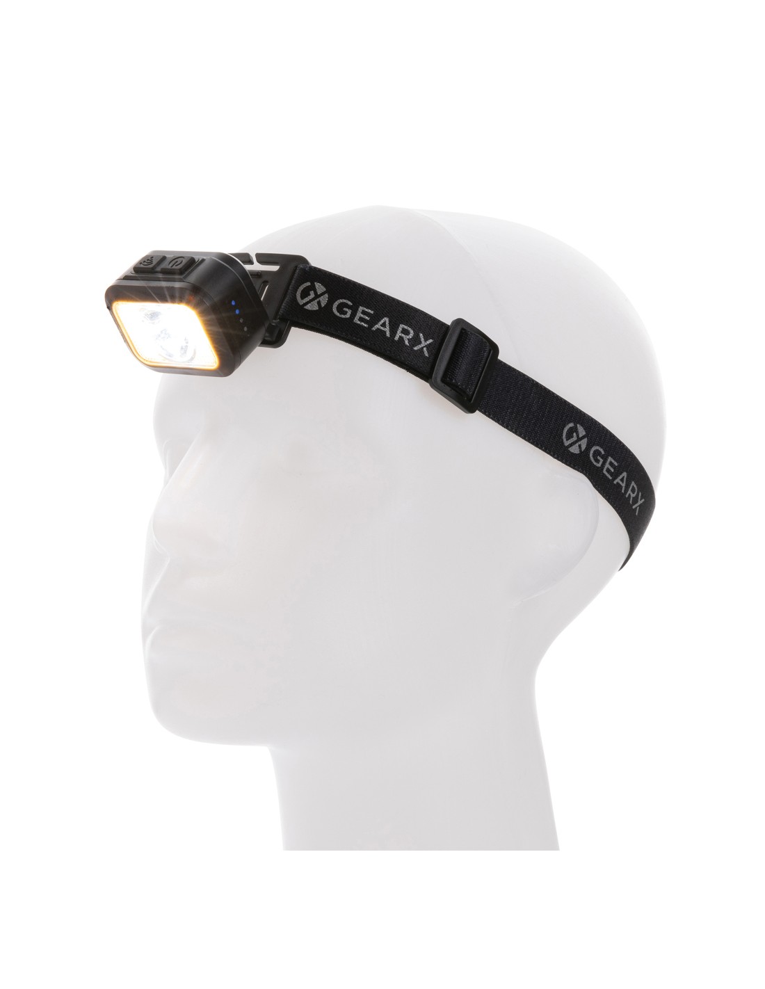 Kraftig pandelampe med integreret COB- og LED-lys med høj effekt. Pandelampen kan producere op til 250 lumen og har en rækkevidde på 70 meter. Pandelampens kabinet er lavet af RCS-certificeret genanvendt ABS-plast. RCS (Recycled Claim Standard) er en standard, der verificerer et produkts genanvendte indhold i hele forsyningskæden. Samlet genanvendt indhold: 23 % baseret på varens samlede vægt. Pandelampen er IPX4 vandtæt og støvafvisende. Med justerbart hovedbånd, der passer til alle størrelser. Pandelampen har et 800 mAh genopladeligt litiumbatteri, der giver 3 timers uafbrudt brug på en opladning. Med 6 lystilstande, der inkluderer 100%-50% og SOS-tilstand. Genopladning er let via type C.