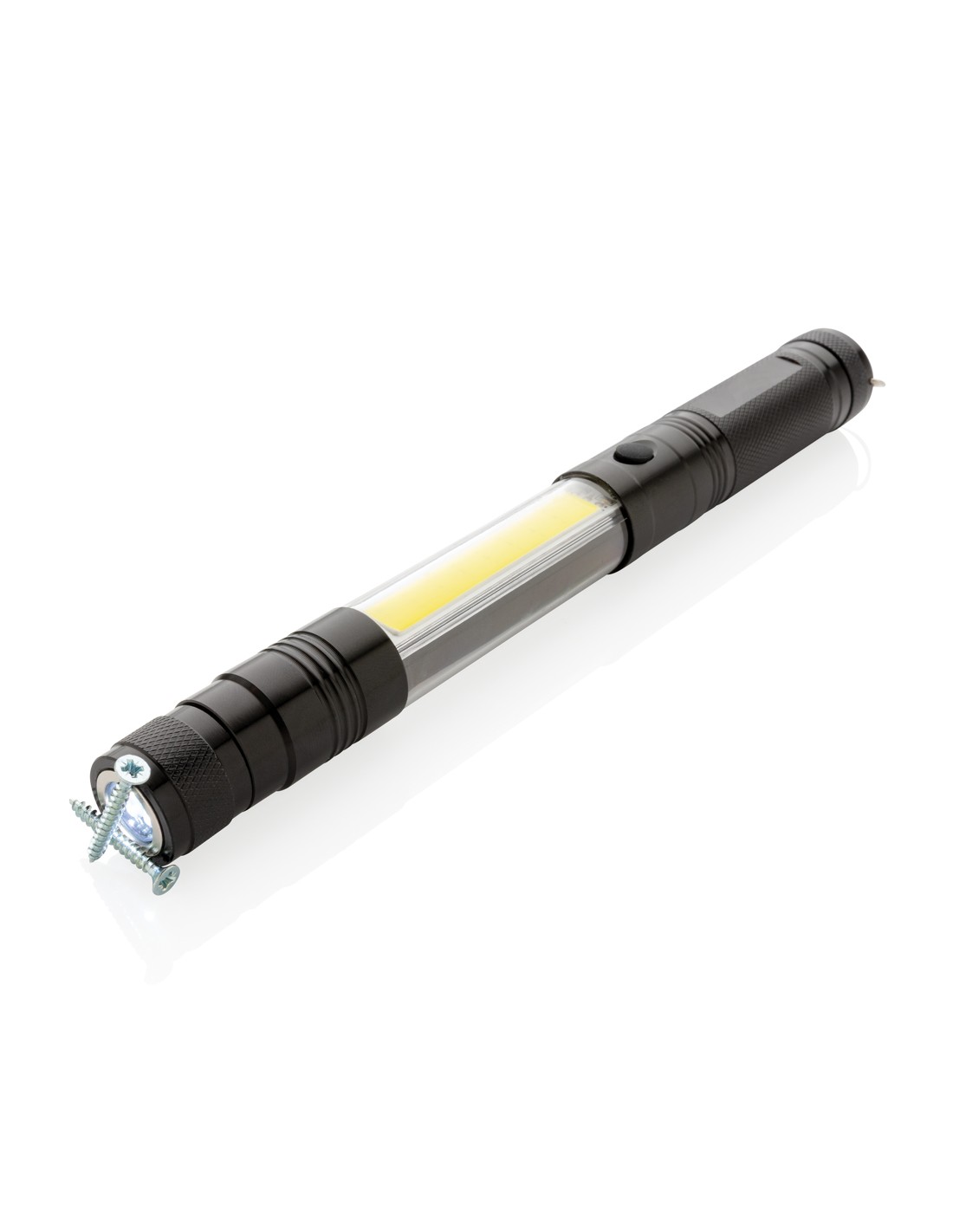 Det perfekte arbejdslys til mange formål. Dobbelt magnetisk LED arbejdslys, påsæt den metaloverflader for optimal belysning. Denne aluminiums lygte lan udvides fra 26 til 64 cm, så kan du med magneten nå metal dele steder du ikke kan komme til. Lygten er udstyret med 3 LED 10 dioder for ekstra skarpt lys og har også et COB lys på 80 Lumen. Når lygtens hoved er udvidet er det fleksibelt og kan drejes i forskellige retninger. Leveres med batterier.