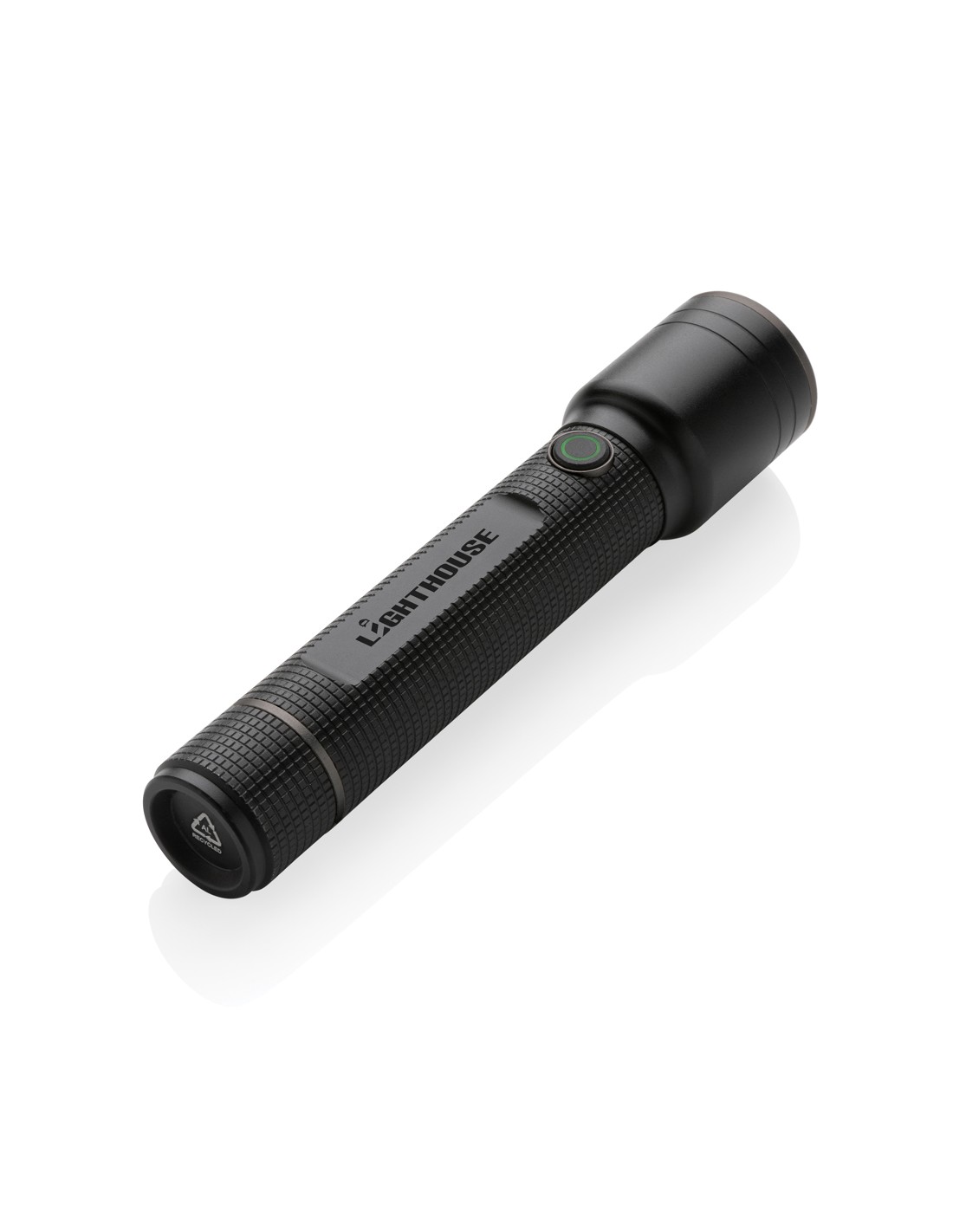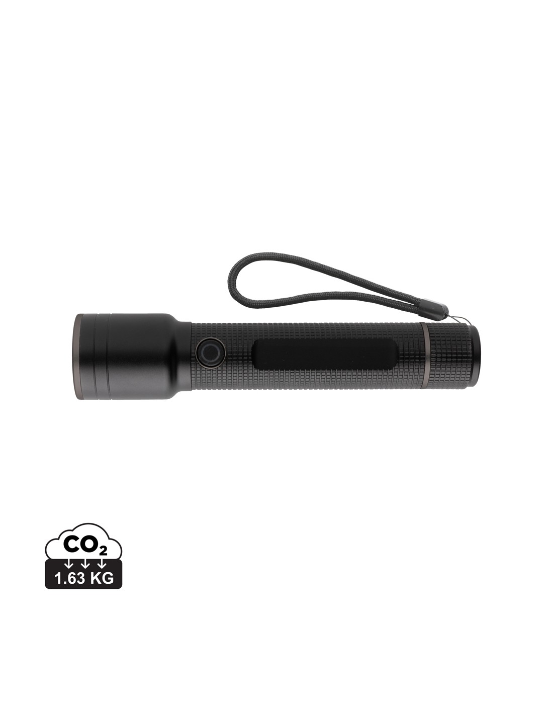 Funktionalitet, ydeevne og design er samlet i denne genopladelige 10 W lommelygte fremstillet af RCS-certificeret genanvendt aluminium. Samlet genanvendt indhold: 20 % baseret på den samlede vægt af produktet. RCS-certificering sikrer en fuldstændig certificeret forsyningskæde af de genanvendte materialer. På grund af dens IP4-klassificering er den vejrbestandig, så den kan nemt tages med udenfor. Den kraftige pære skaber op til 800 lumen og en lyskegle, der rækker op til 500 meter. Lommelygten bruger et genopladeligt a-klasse batteri, så du behøver ikke at udskifte batterierne. Du skal blot oplade via din USB-stik og det medfølgende RCS-certificerede genanvendte type C-kabel. Pæren af høj kvalitet leveres med 5 tilstande, herunder SOS-funktion. Batteriet på 2000 mAh giver mulighed for op til 8 timers brug på en enkelt opladning og gør det også muligt at oplade dine mobile enheder via type C. Aluminium mister ikke sine egenskaber i genanvendelsesprocessen og kan genanvendes i det uende