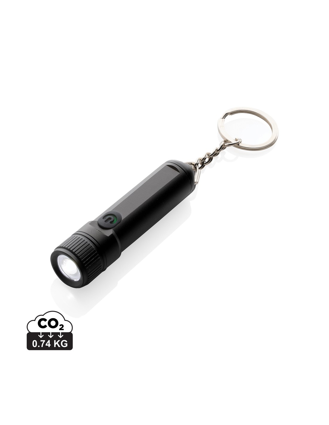 Ultraklar lommelygte i lommestørrelse fremstillet af RCS genanvendt aluminium Samlet genanvendt indhold: 58 % baseret på varens samlede vægt. RCS certificering sikrer en fuldstændig certificeret forsyningskæde af de genanvendte materialer. Lommelygten har et superskarpt 120 lumen XTE LED-lys, der skaber en stråle på op til 30 meter. Lygten har et 200 mAh klasse A litiumbatteri, der giver en driftstid på op til 1 time med hurtig genopladning via USB-C på under 1 time. Lygten er IPX 4-vandtæt, så den er også velegnet til brug under dårlige vejrforhold. Lygten har 3 tilstande: 100%/50% og blinkende. Pakket i plastfri FSC-gaveæske. Inklusive genanvendt TPE USB C-opladerkabel.