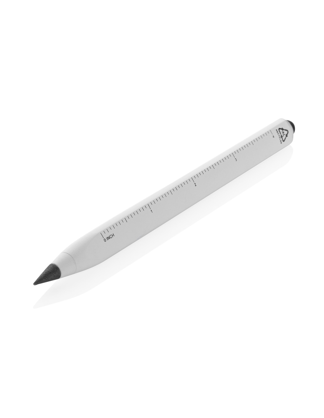 Moderne uendelighedspen fremstillet af RCS certificeret genanvendt aluminium. Samlet genanvendt indhold: 40 % baseret på den samlede vægt af varen. RCS-certificering sikrer en fuldstændig certificeret forsyningskæde for de genanvendte materialer. Trekantformet krop med en side med CM-angivelse og en side med tommer. Traditionelle træblyanter skriver kun op til ca. 200 meter, men denne Tree free infinity pencil, har en skrivelængde på op til ca. 20000 meter ved hjælp af en grafitspids til at producere en grafitlinje. Den skriver ikke kun som en blyant, men markeringerne kan også slettes. Den fungerer ved at efterlade en grafitlinje på papiret ligesom en almindelig traditionel træblyant, men den slides så langsomt, at den skulle holde længere end op til 100 traditionelle træblyanter! Med touch-tip til betjening af mobil enhed. Pakket i FSC®-mixemballage.