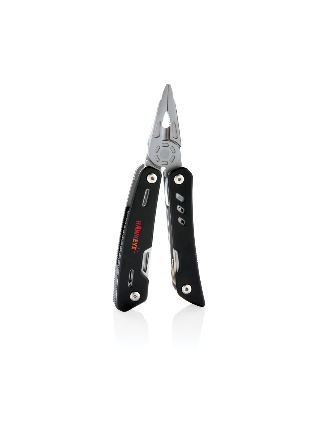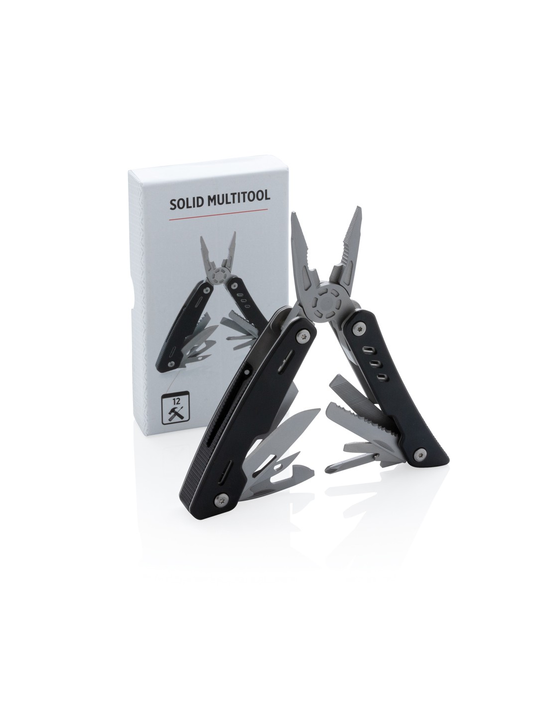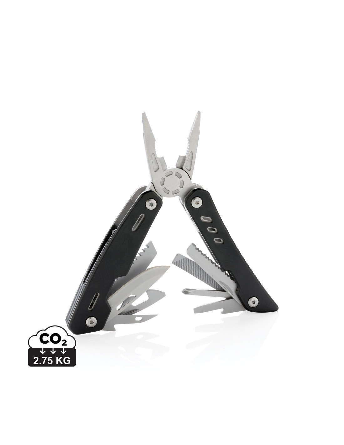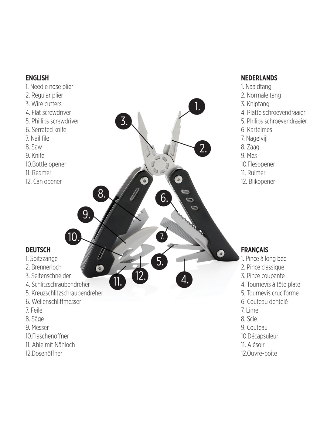 Stærkt og holdbart multiværktøj med 12 funktioner. Fremstillet af aluminium og med værktøj i rustfrit stål. Inkluderede værktøjer: spidstang, almindelig tang, ledningsskærer, kniv, phillips skruetrækker, lille flad skruetrækker, sav, dåseåbner, oplukker, savtakket kniv, syl med nåleøje, fil og stor flad skruetrækker. Pakket i gaveæske.