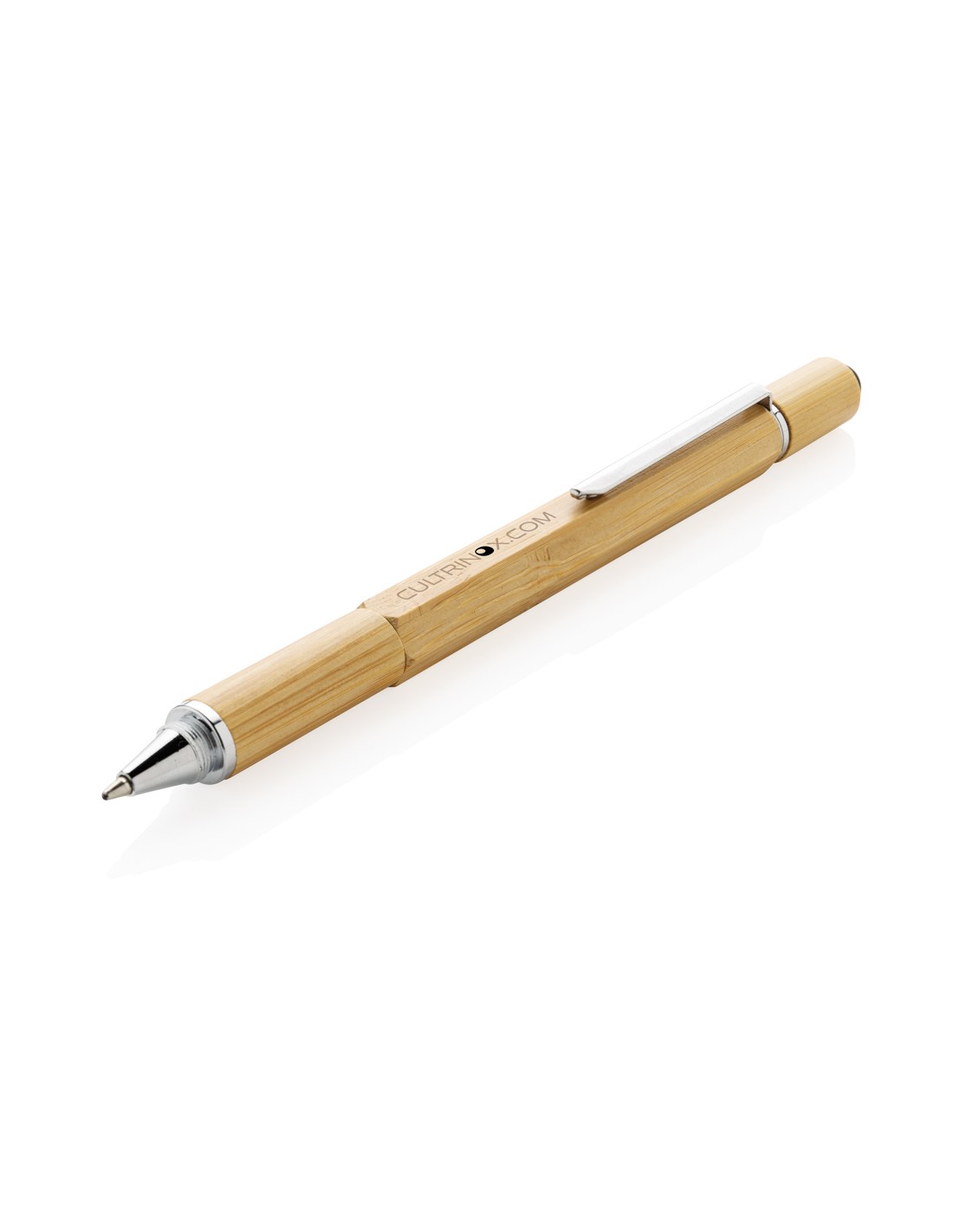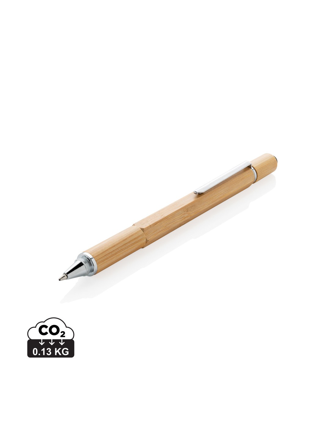 Multifunktions bambus pen med; 7 cm lineal, vaterpas, skruetrækker, stylus tip, ballpoint med blå blæk (op til 400 meter skrivelængde). Fremstillet af bambus og aluminium clip.
