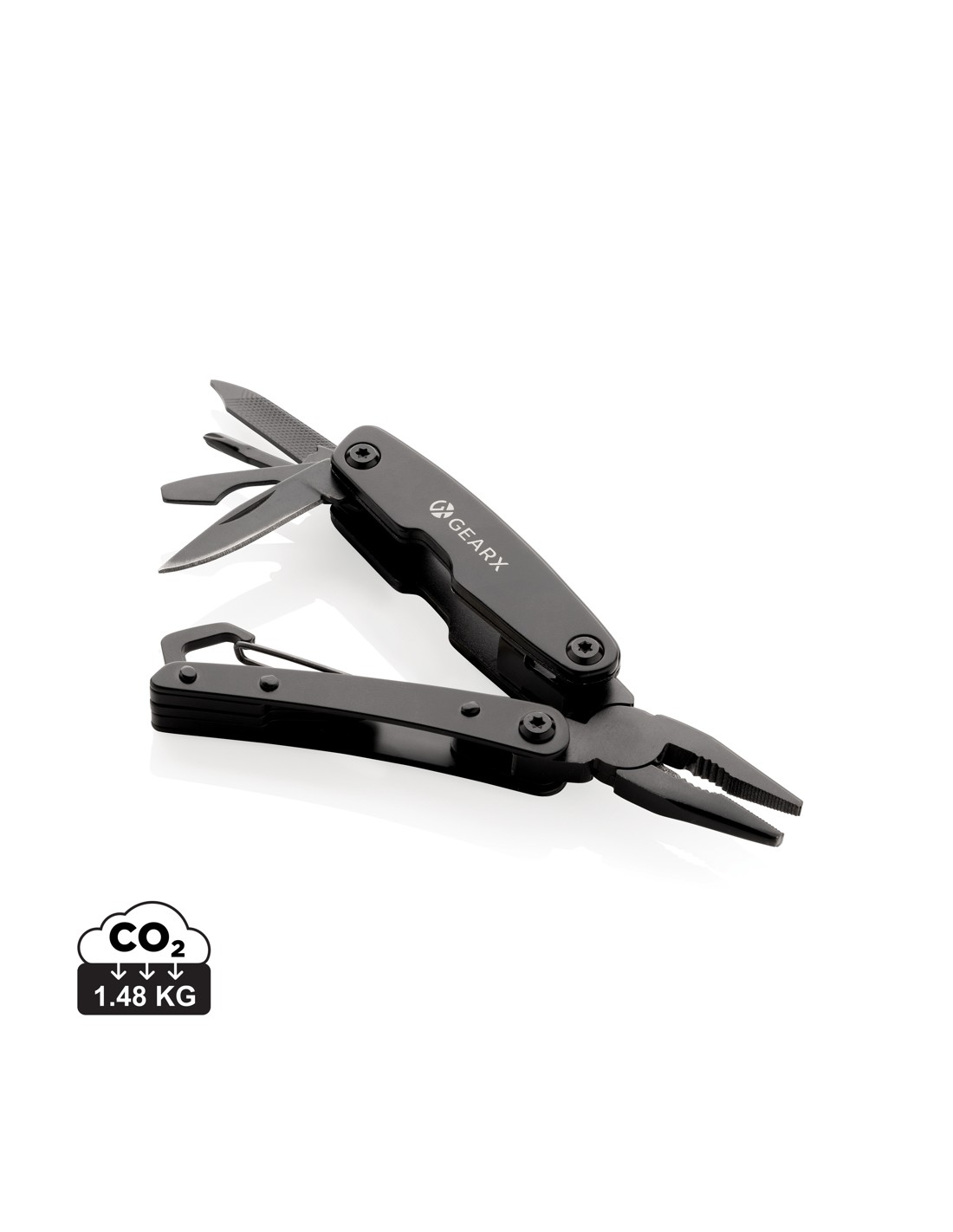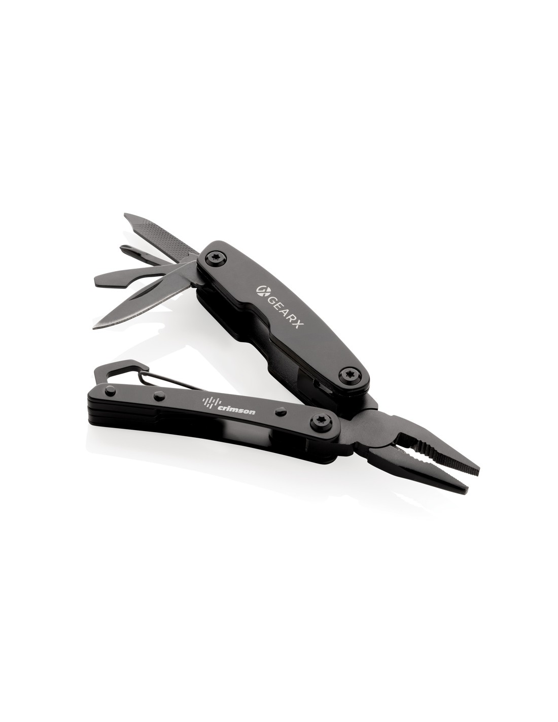 Multiværktøj i lommestørrelse fremstillet af stærkt 420 rustfrit stål. Med flere funktioner, der omfatter: Spidstang, standardtang, trådskærer, kniv, oplukker, flad skruetrækker, Philips-skruetrækker, fil, filrenser og karabinhage. Pakket i FSC®-mix-emballage